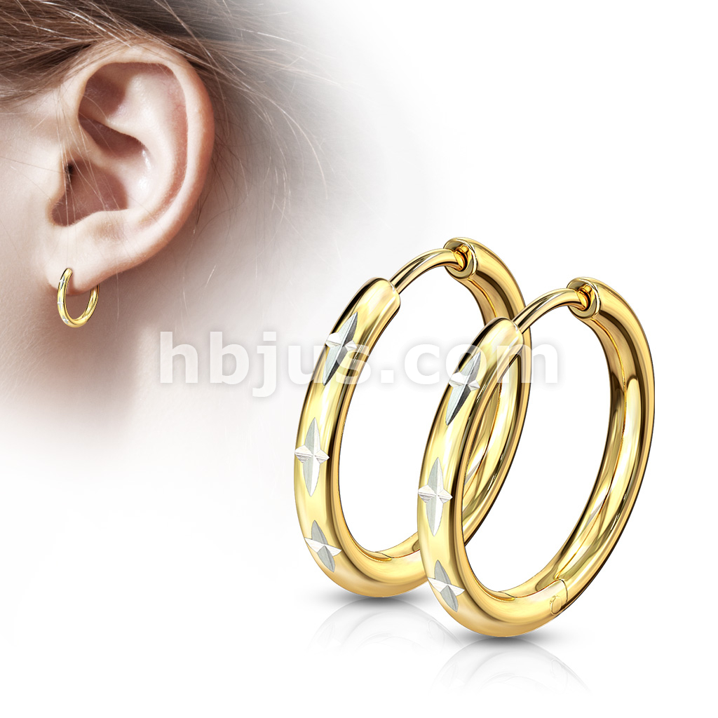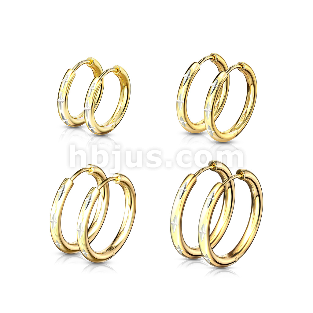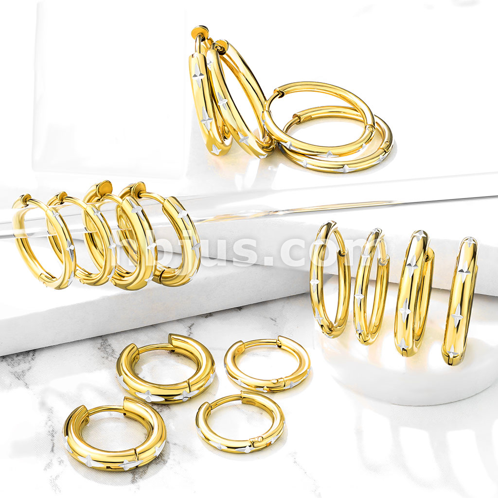 Pair of Cross Cut Gold IP Stainless Steel Hinge Action Hoop Earrings