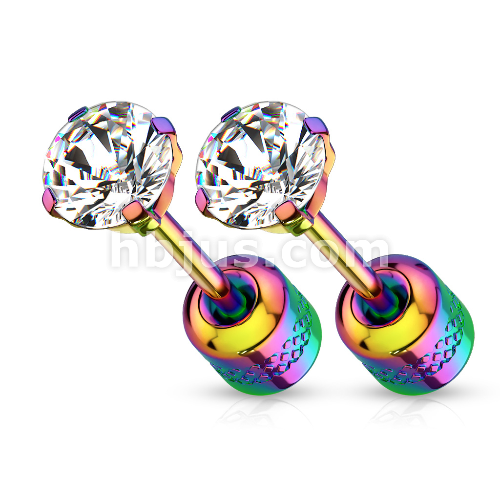 Pair of Prong Set Round Clear CZ Gem Top 316L Surgical Steel Externally Threaded Earring Studs With CZ Centered Screw Back