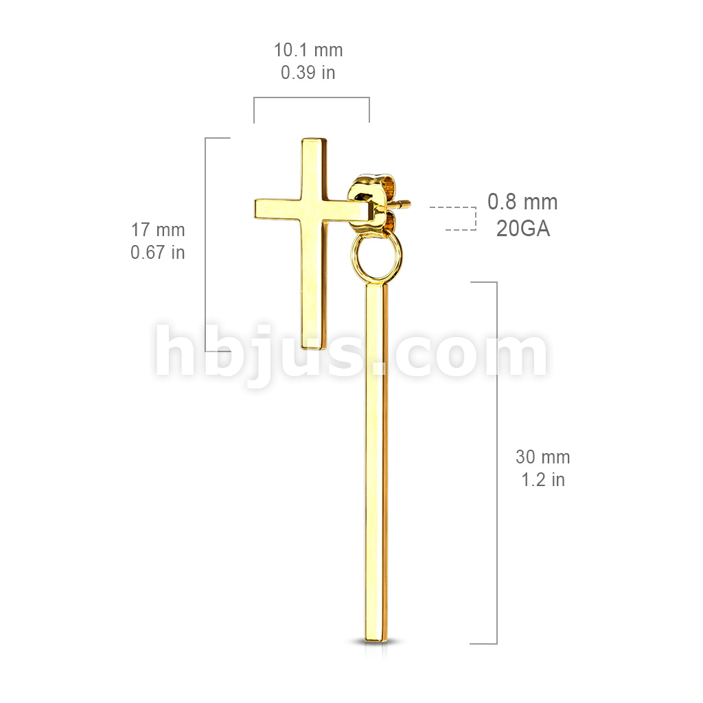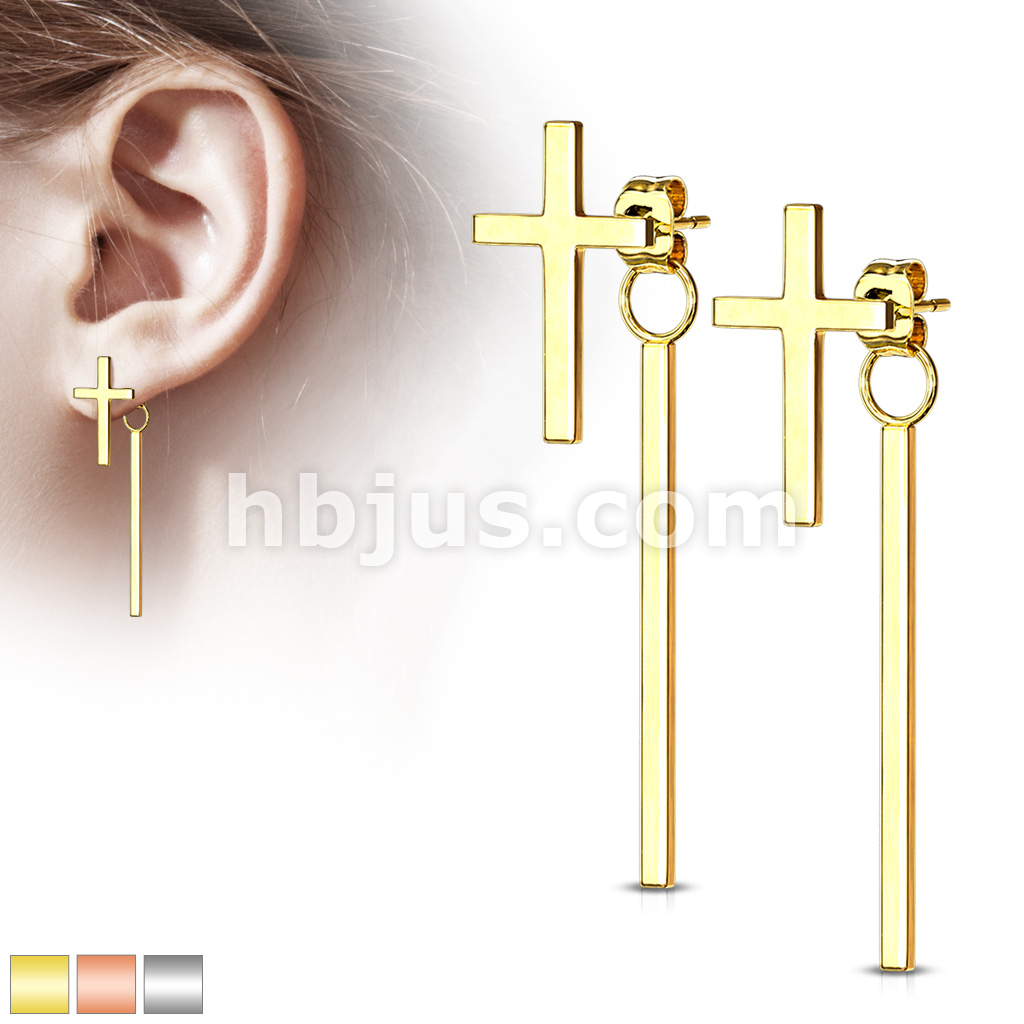 Pair of Cross 316L Stainless Steel Stud Earrings with Dangling Bar on Butterfly Clasp