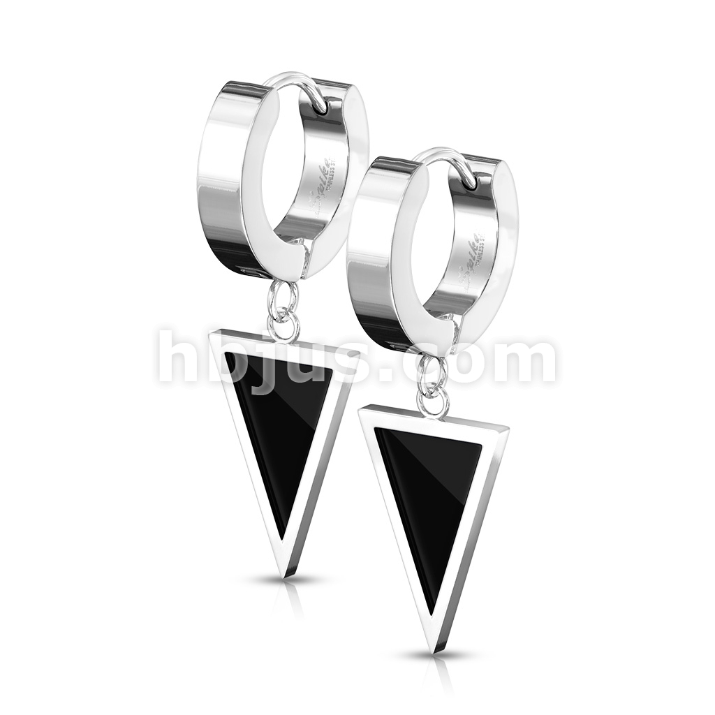 Pair of Stainless Steel Hinged Hoop Earrings with Black Enamel Filled Triangle Dangle