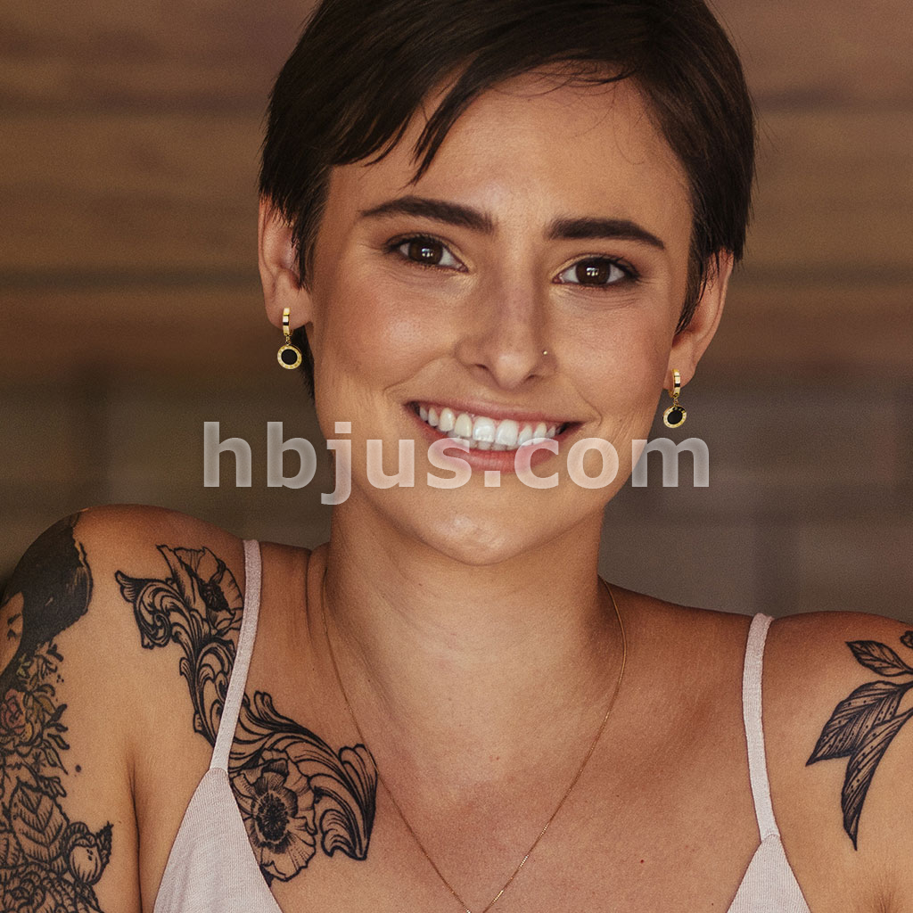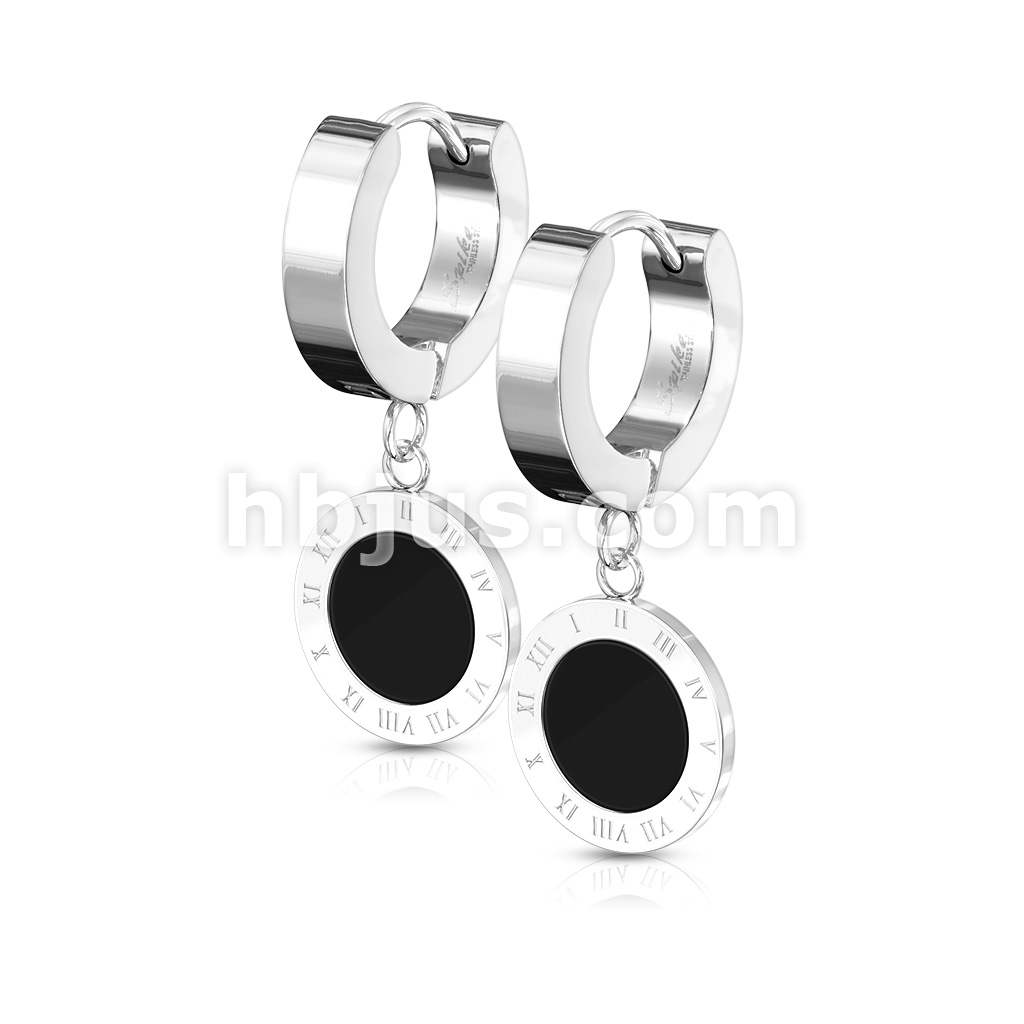 Pair of Stainless Steel Hinged Hoop Earrings with Black Enamel Filled Center and Roman Numeral Edges Circle Dangle