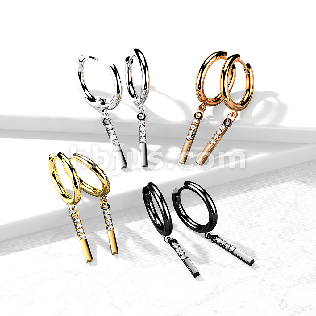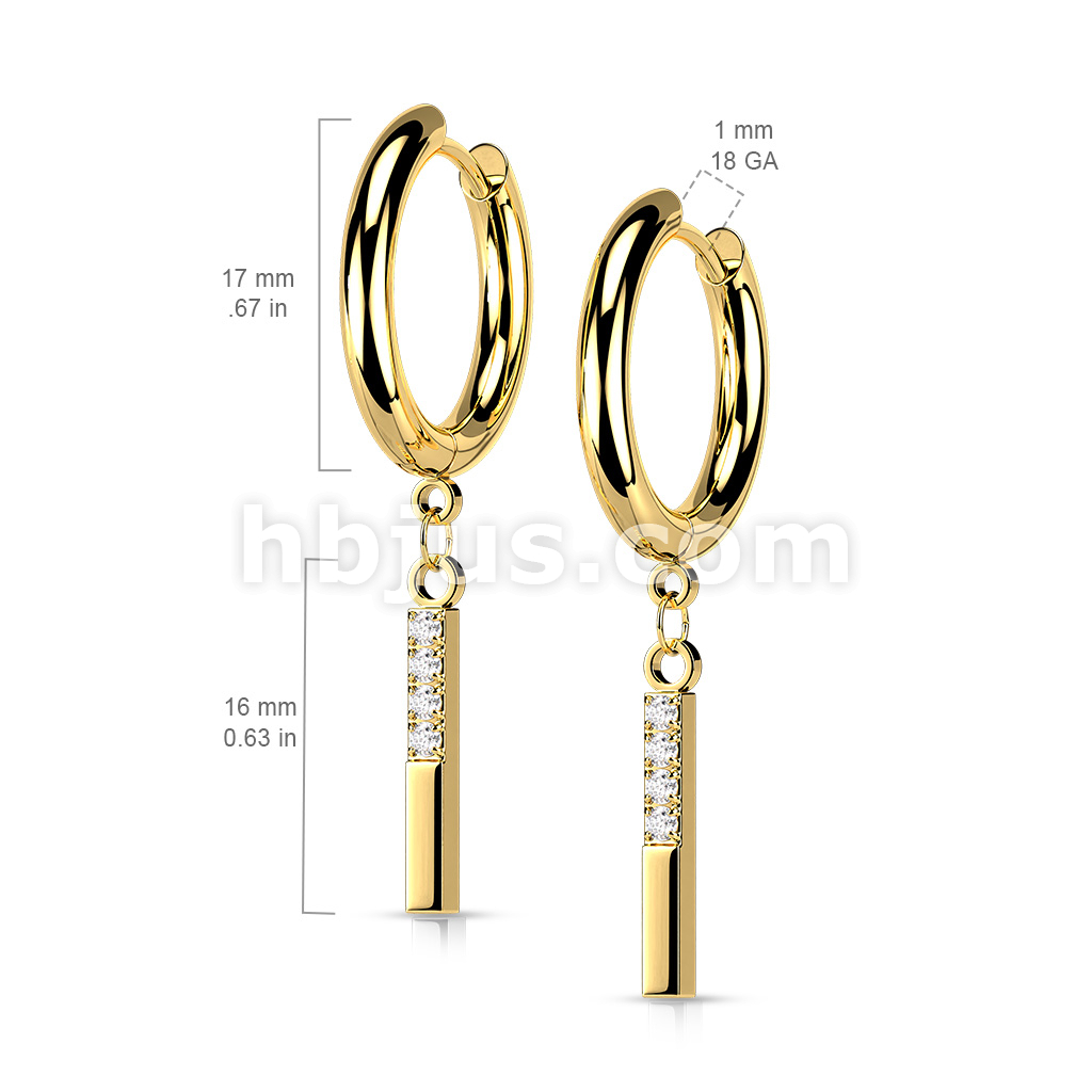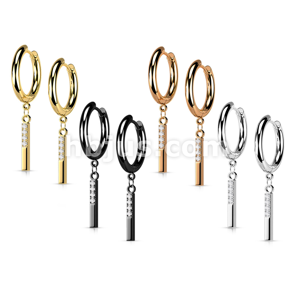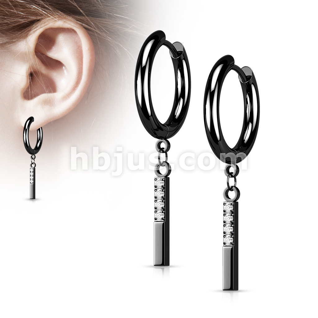 Pair of 316L Surgical Steel Hoop Earrings with CZ Paved Rectangle Dangle