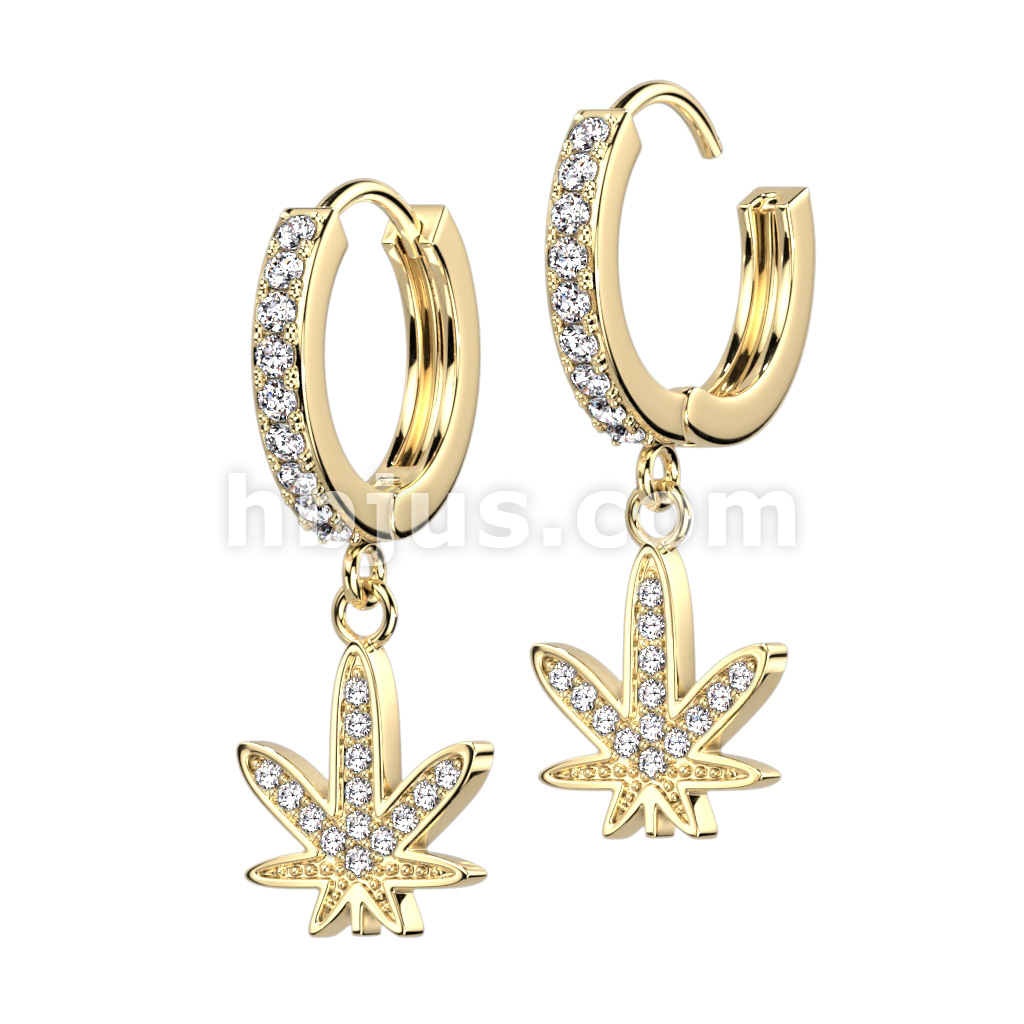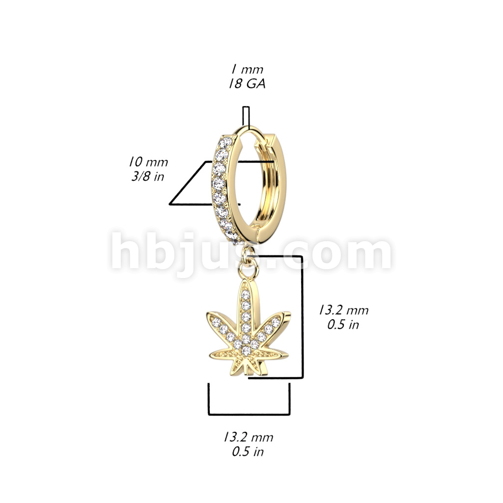 Pair of CZ Paved Front With CZ Paved Pot Leaf Dangle Hoop Earrings
