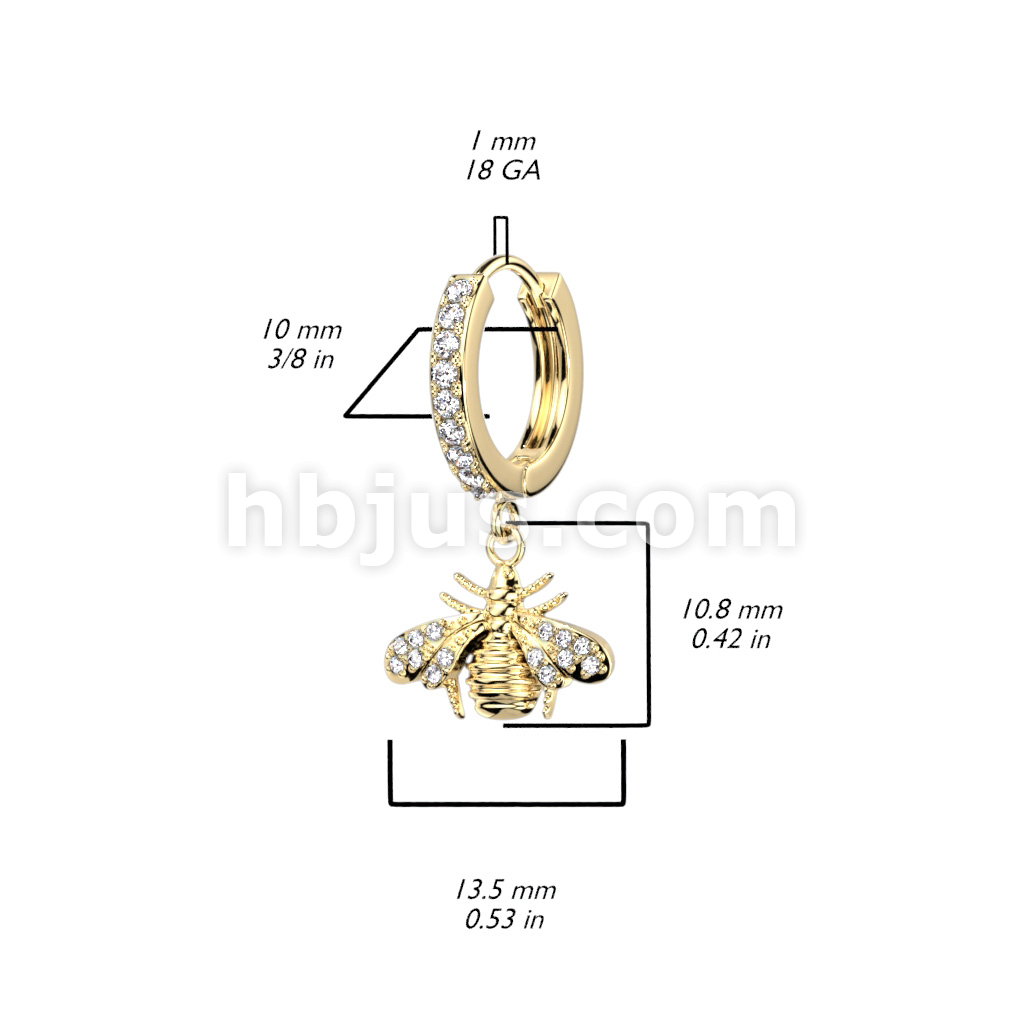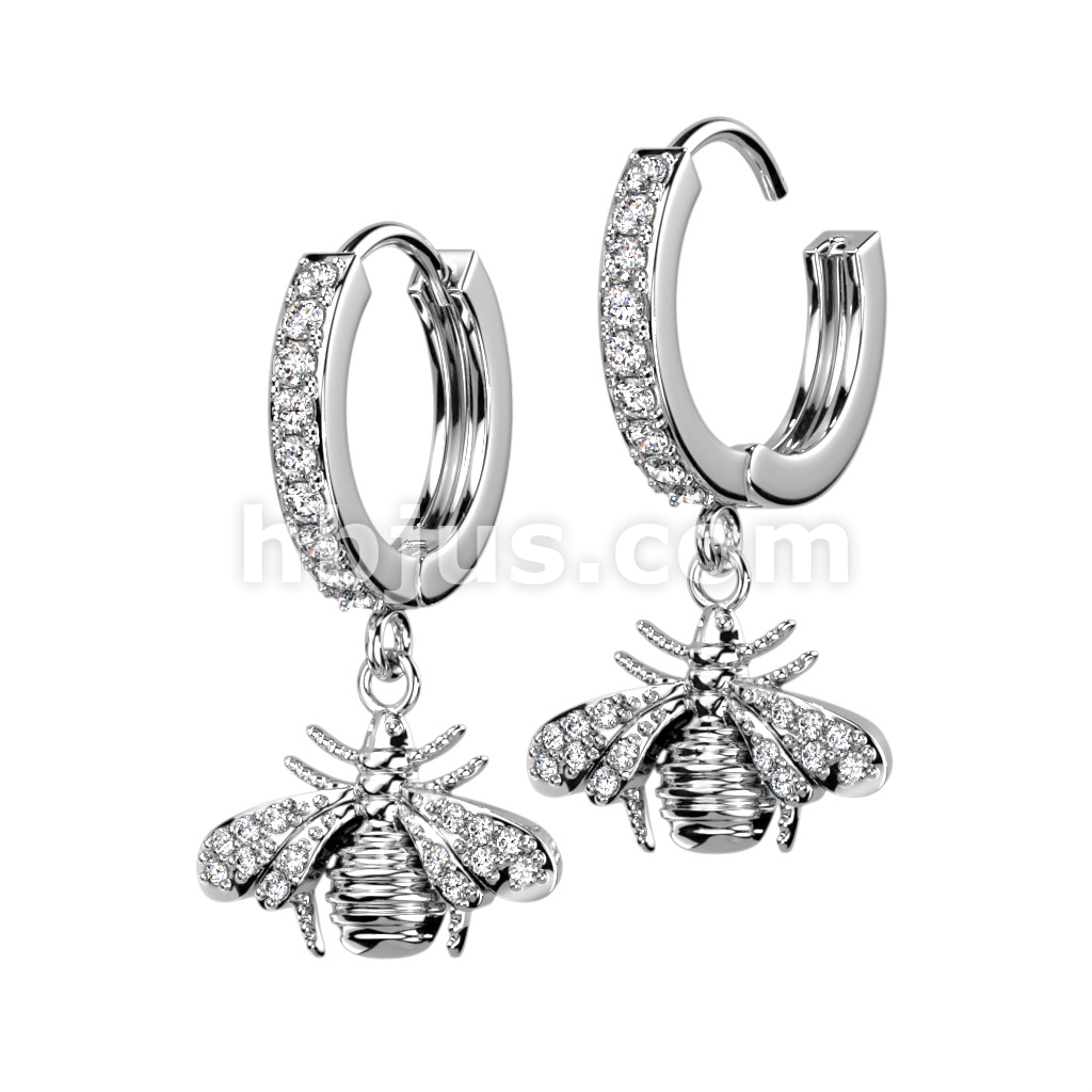 Pair of CZ Paved Front With CZ Paved Bee Dangle Hoop Earrings