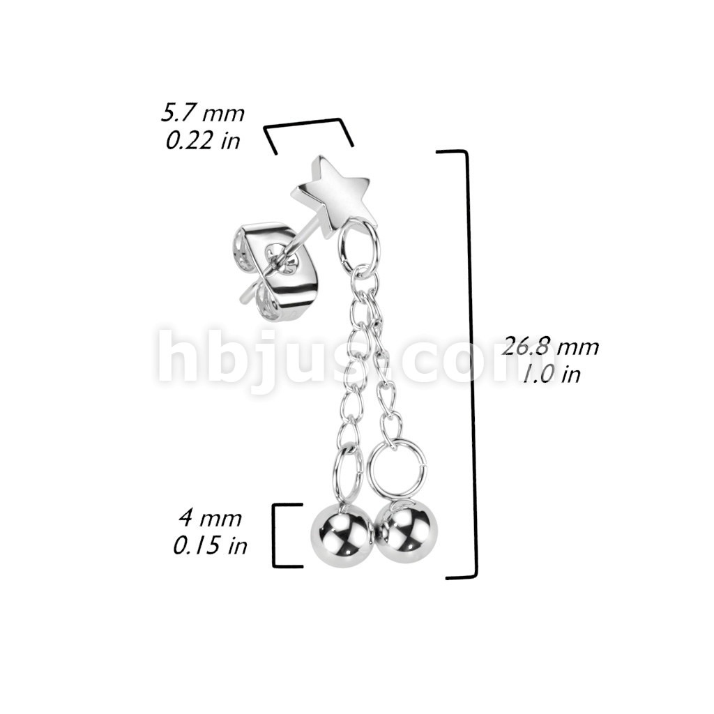 Pair of Hand Polished Star With 2 Chain Drop Ball Dangles 316L Stainless Steel Earring Studs