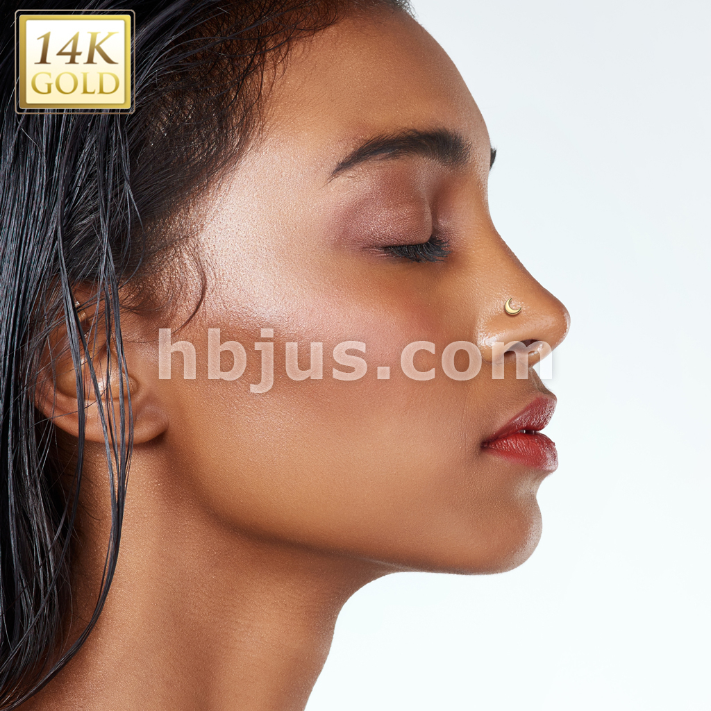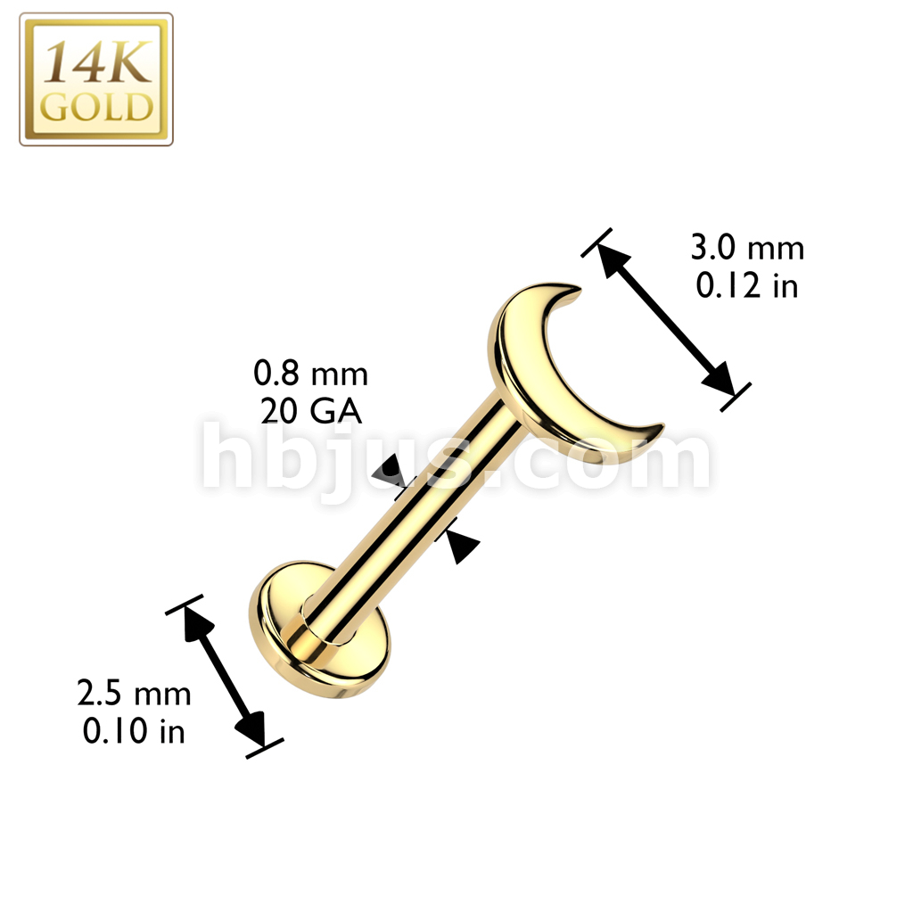 14K Gold Threadless Push In 20ga Flat Back Stud With Flat Crescent Moon Top For Nose, Ear and More