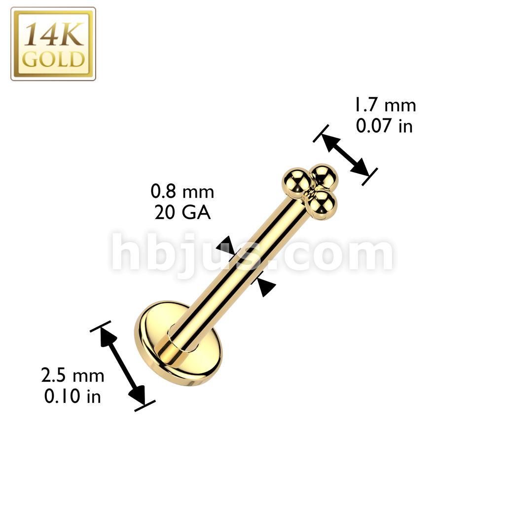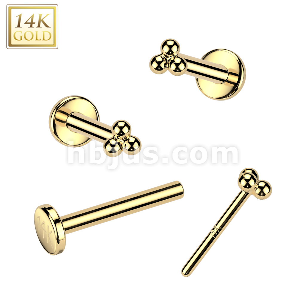 14K Gold Threadless Push In 20ga Flat Back Stud With Triangular Ball Cluster Top For Nose, Ear and More