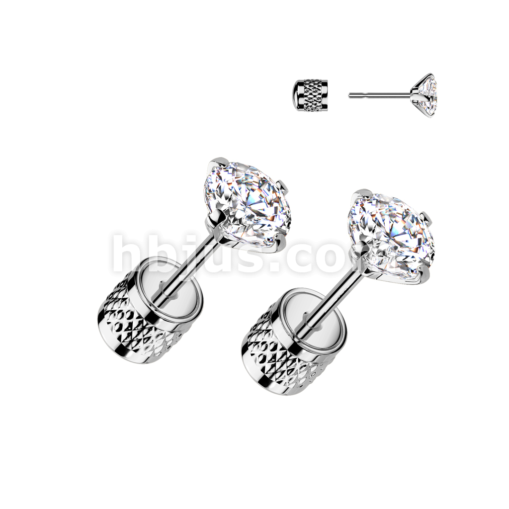 Pair of Round Prong Set Clear CZ Top 316L Surgical Steel Earrings With Cylinder Clip Backing