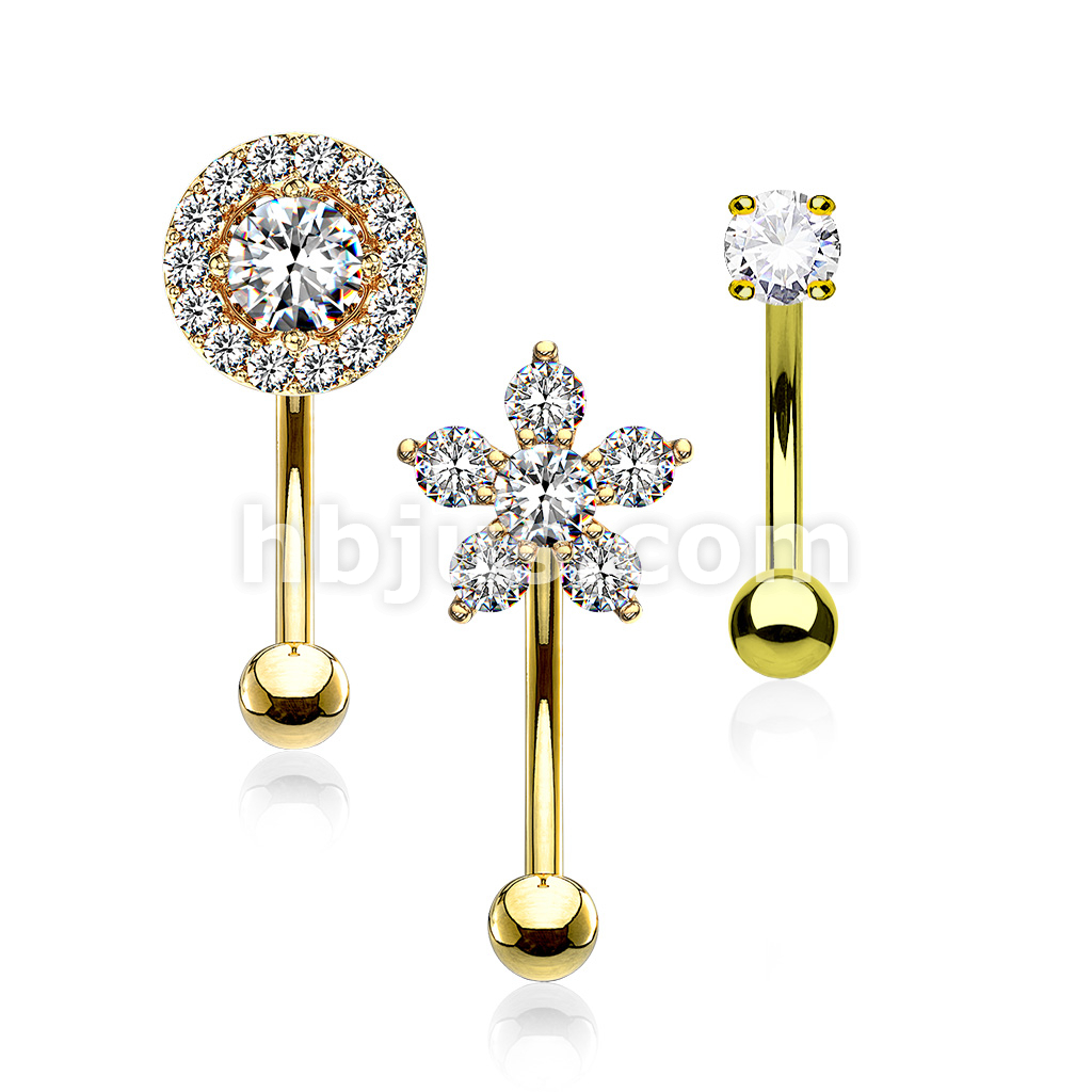 3 Pcs Pre Loaded Assorted 316L Surgical Steel Curved Barbells/ Eyebrow Rings Gem Box Package