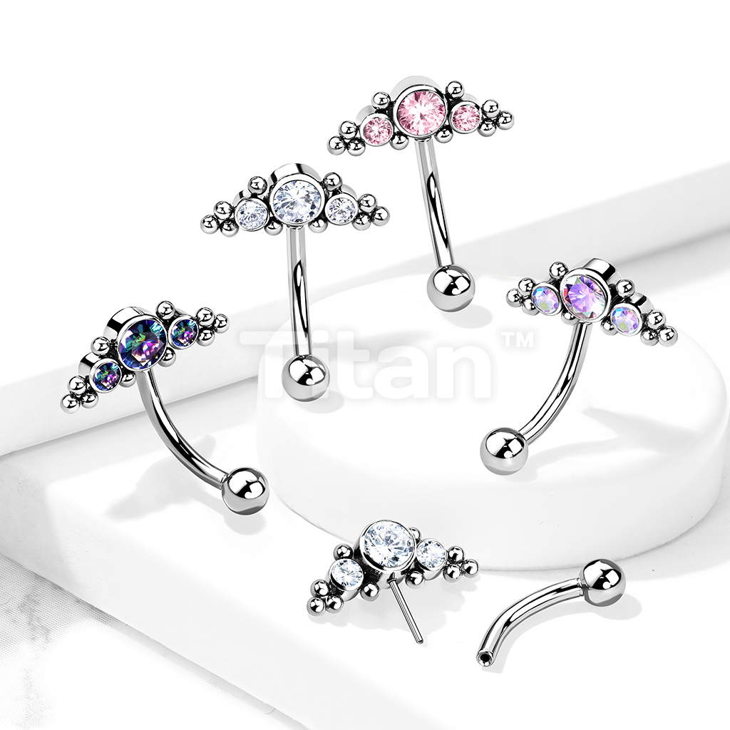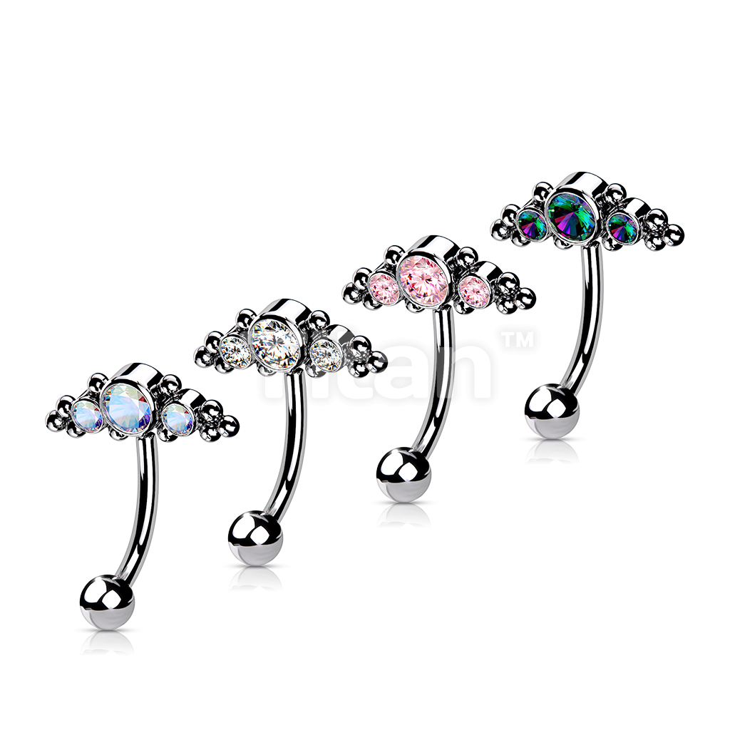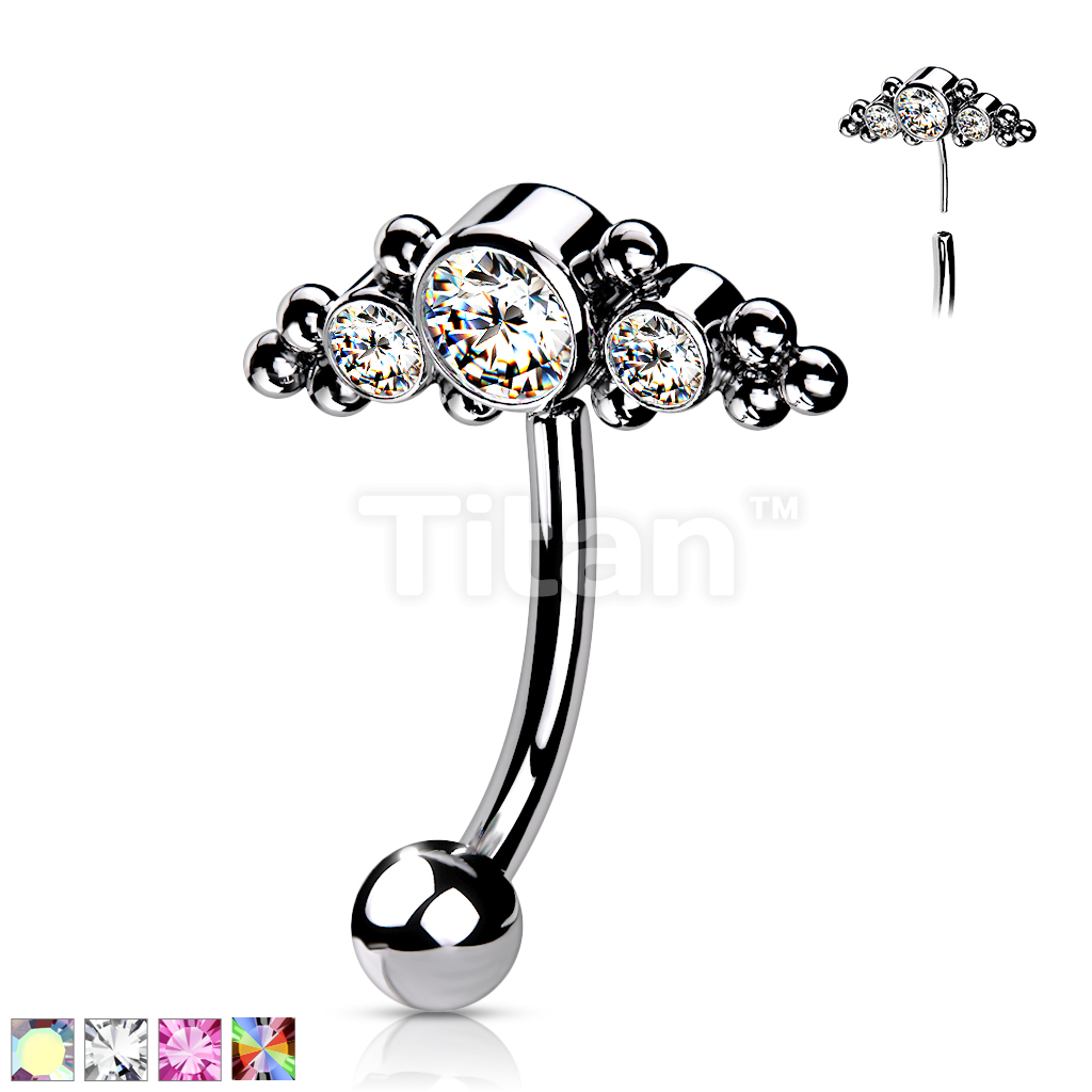 Implant Grade Titanium Threadless Push In Eyebrow Curve With 3 Bezel Set CZs and Ball Clusters