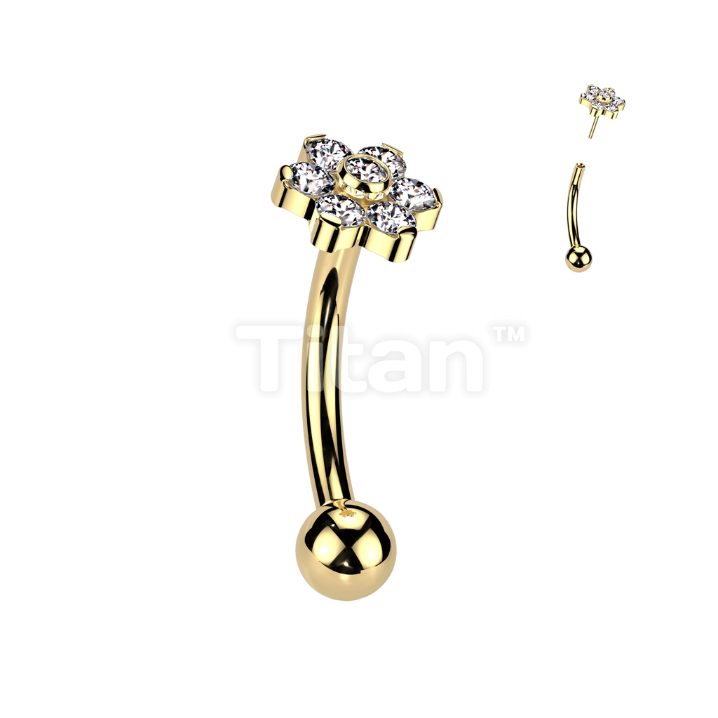 Implant Grade Titanium Threadless Push In Eyebrow Curved Barbell With Prong Set CZ Flower With Bezel Set CZ Center