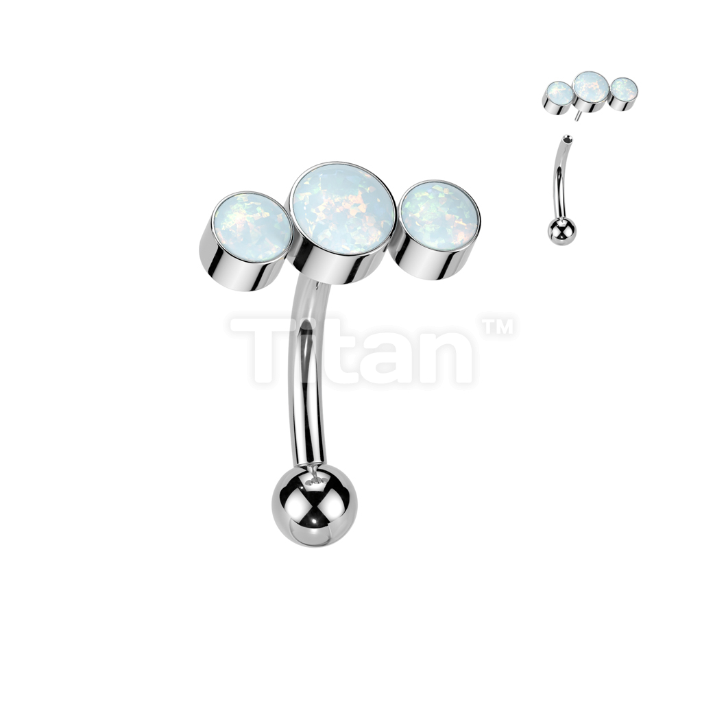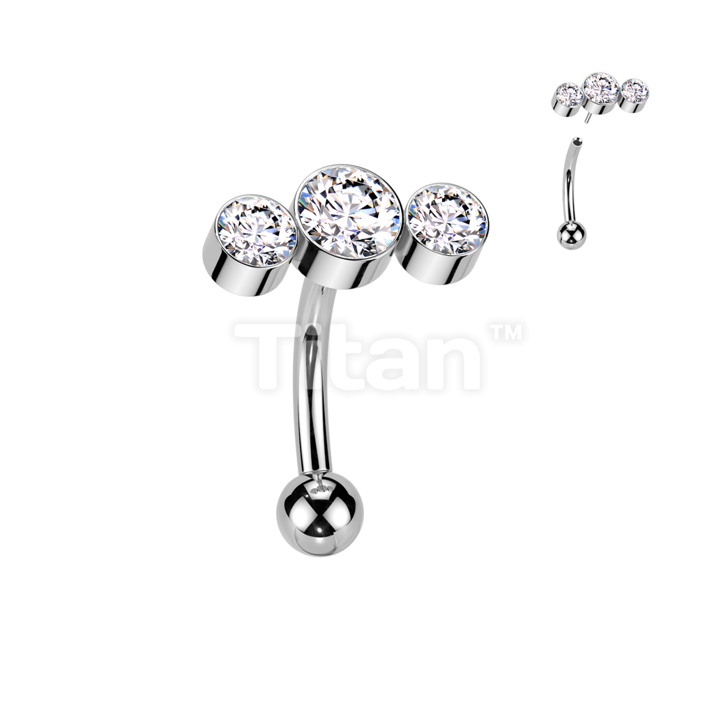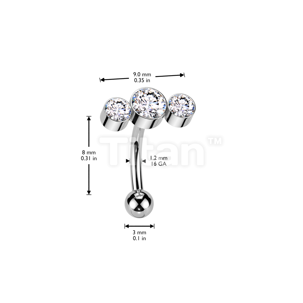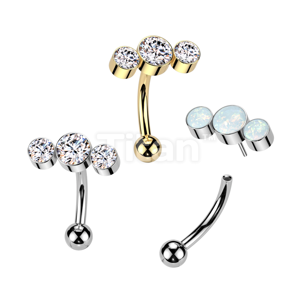 Implant Grade Titanium Threadless Push In Eyebrow Curved Barbell With 3 Round Bezel Set CZ or Opal Curve Top