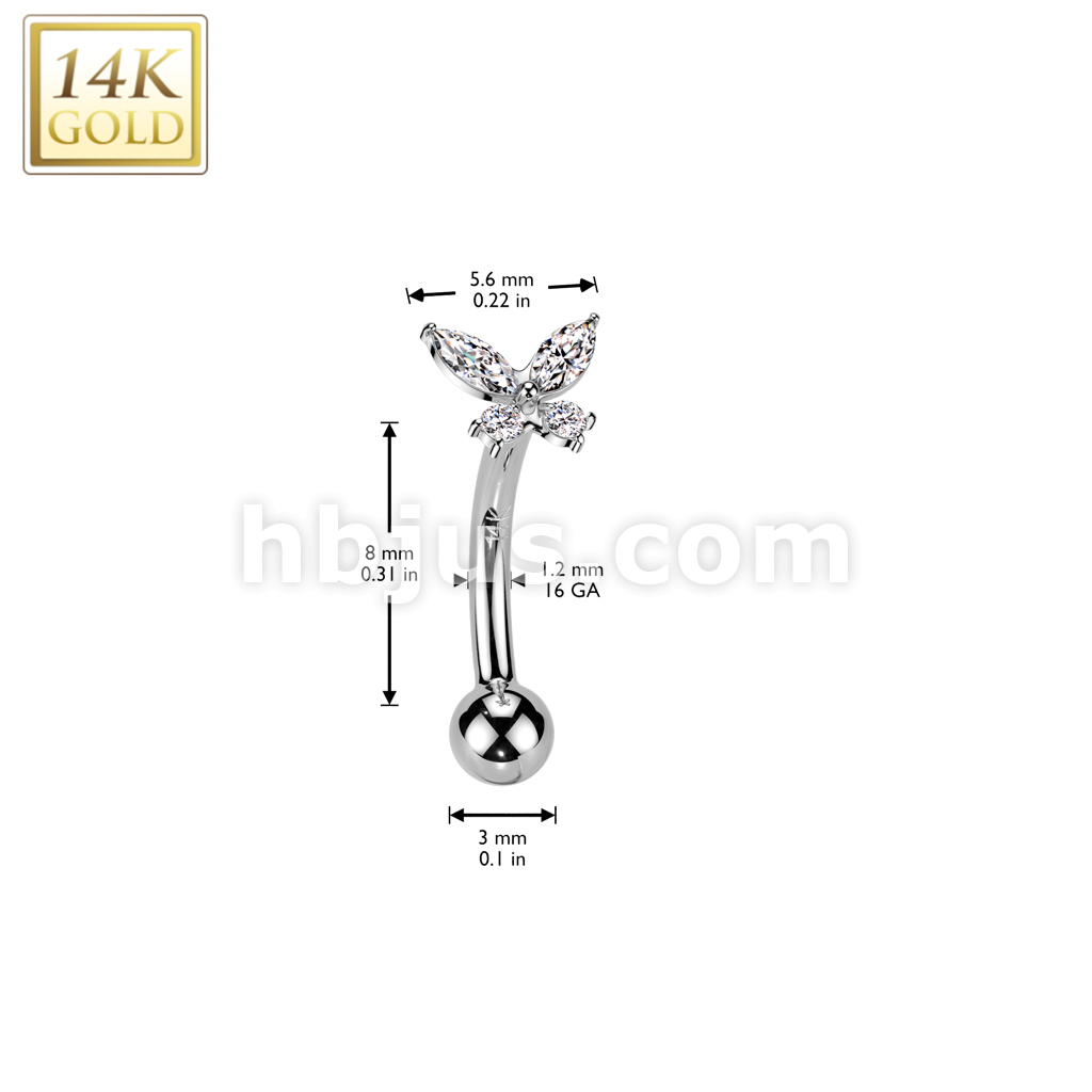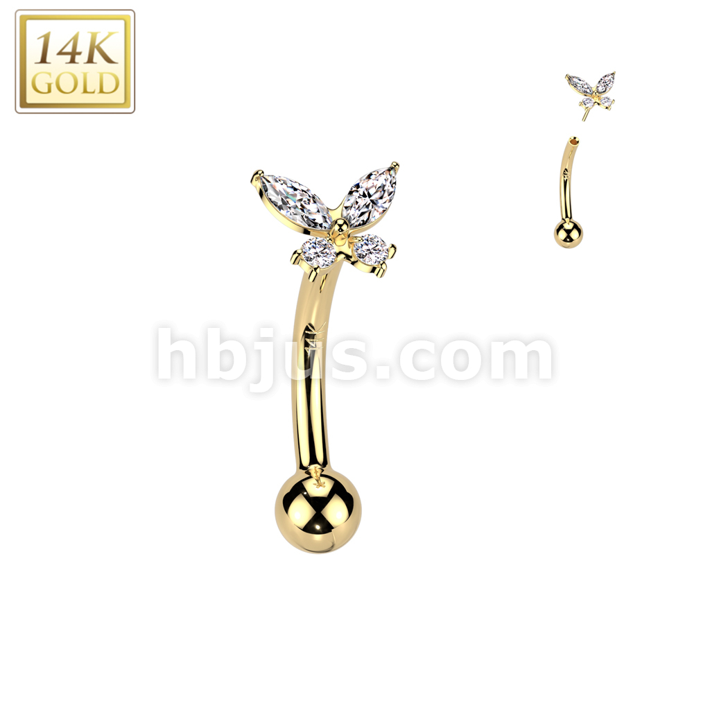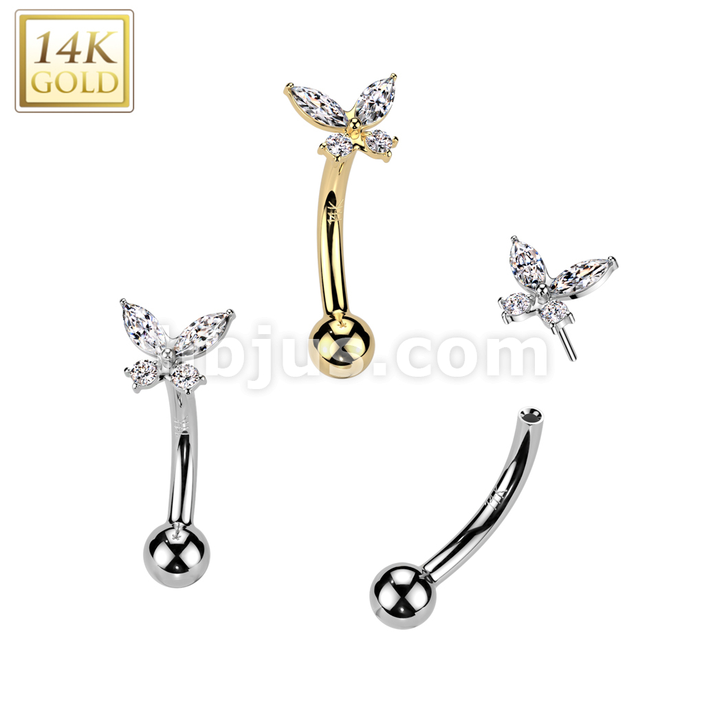14K Gold Threadless Push In Curved Eyebrow Barbell With CZ Butterfly Top