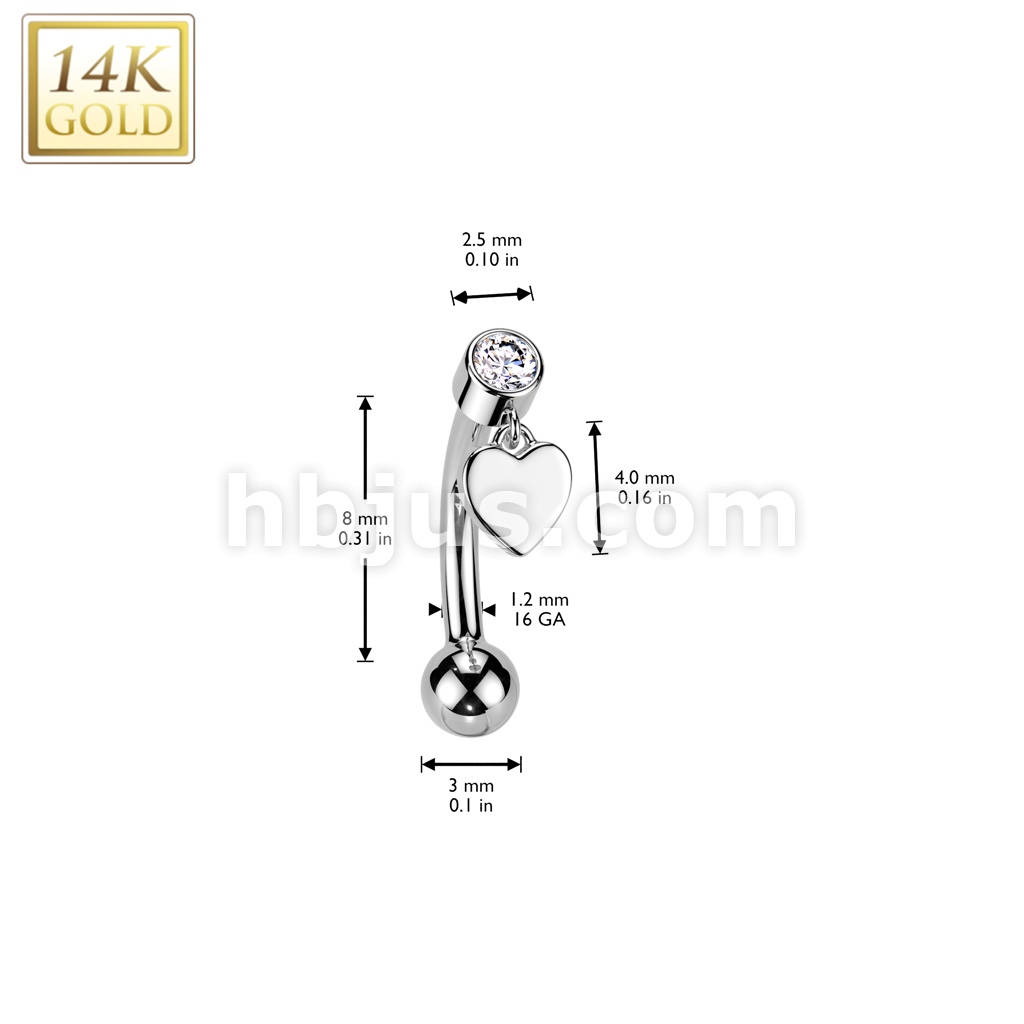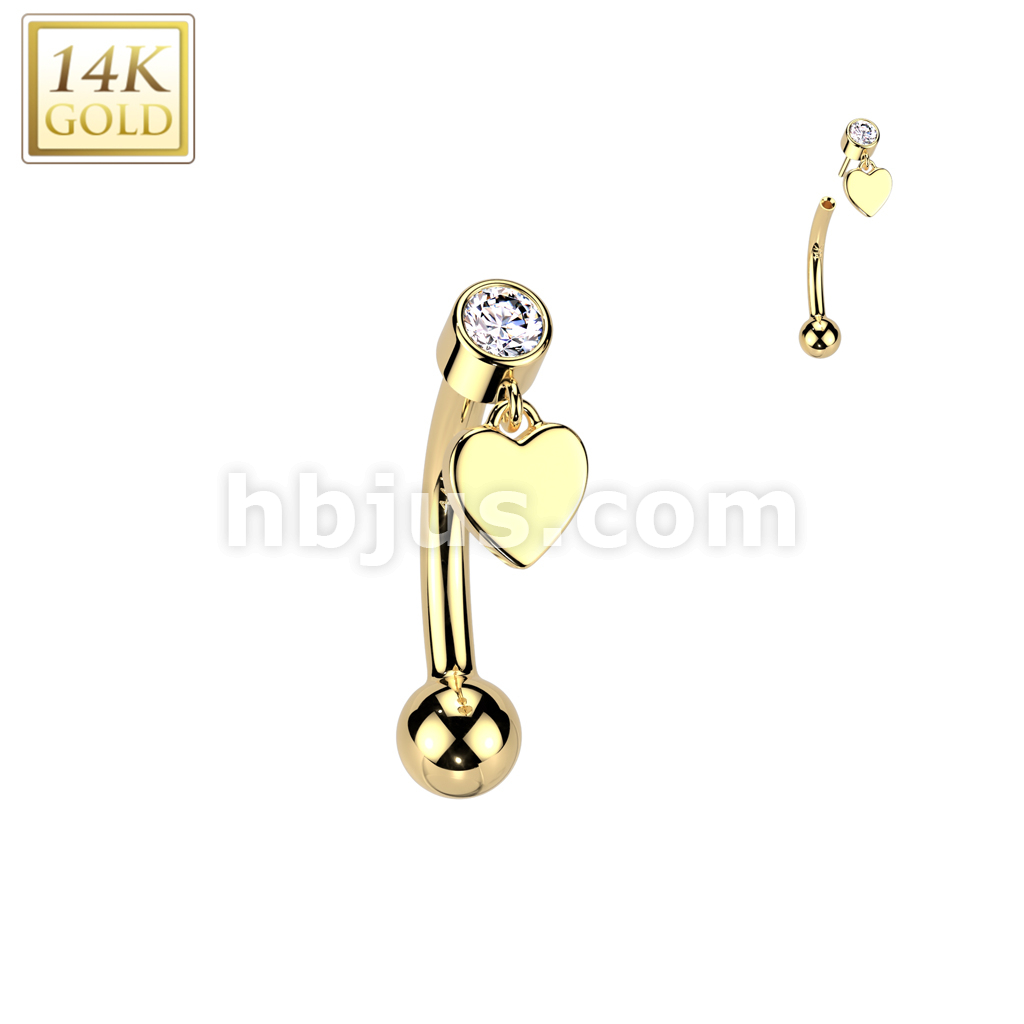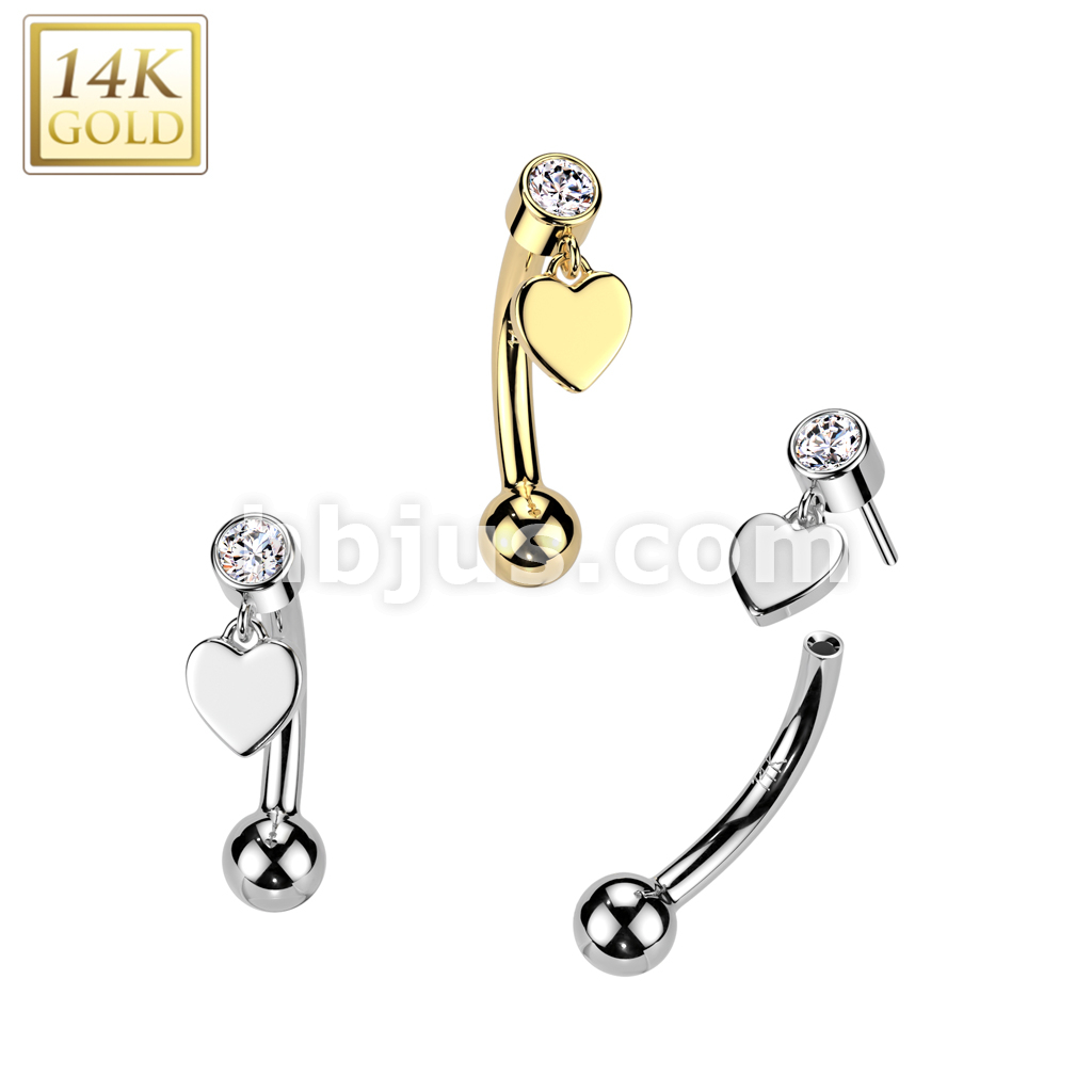 14K Gold Threadless Push In Curved Eyebrow Barbell With Bezel Set CZ Top And Heart Dangle