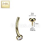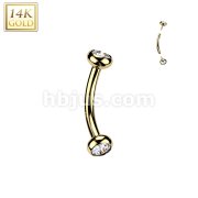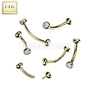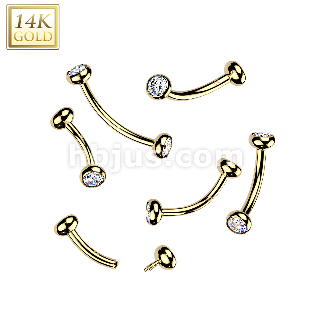 14K Gold Internally Threaded Curved Barbell With Solid Bezel Set CZ Balls