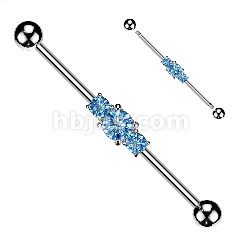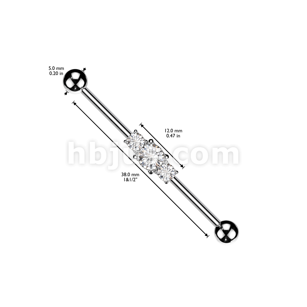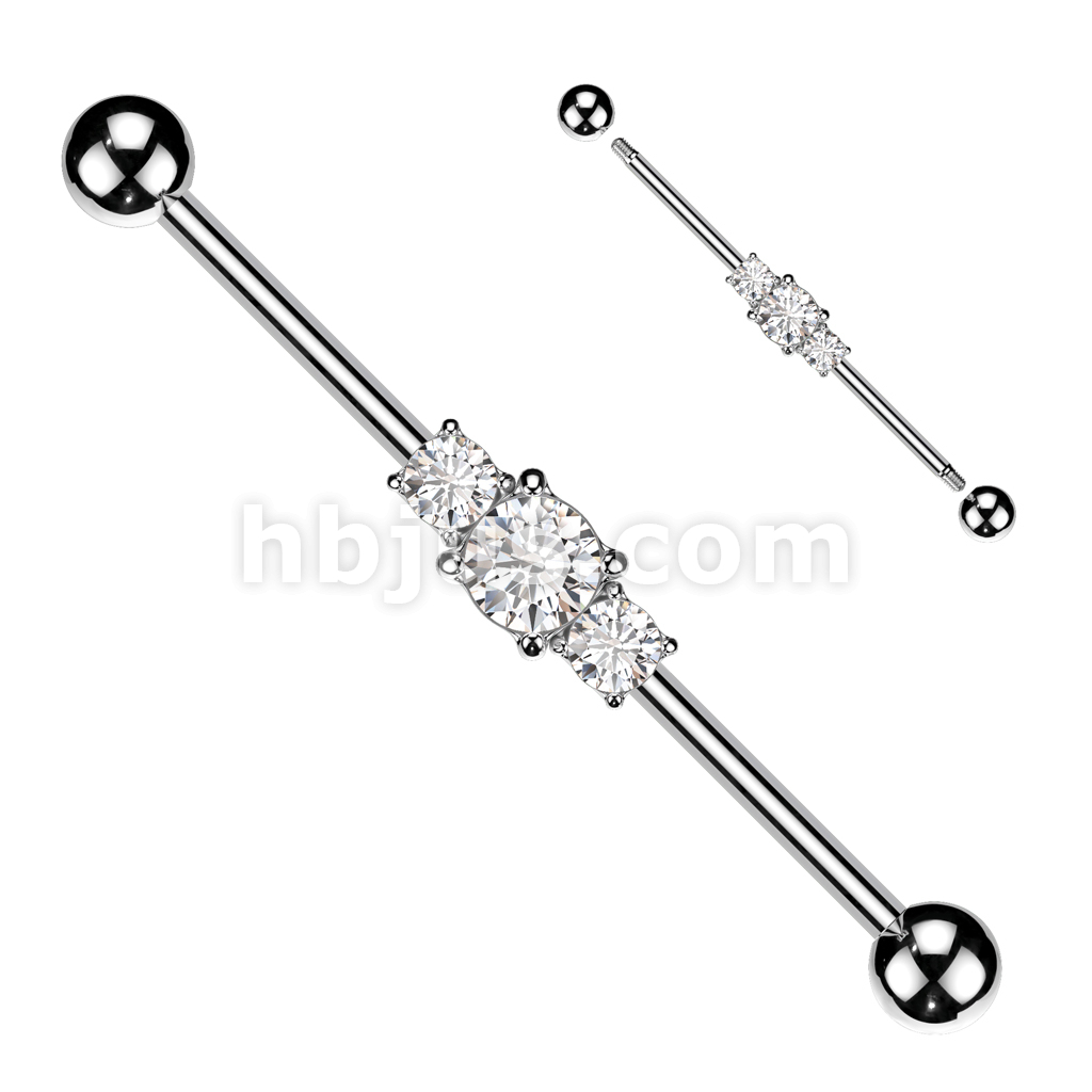 Three Linked CZs Industrial Barbell 316L Surgical Steel