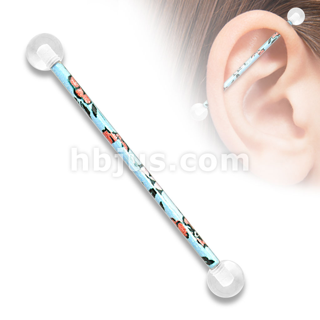 Floral Pattern Printed over 316L Surgical Steel Industrial Barbell with Clear UV Balls