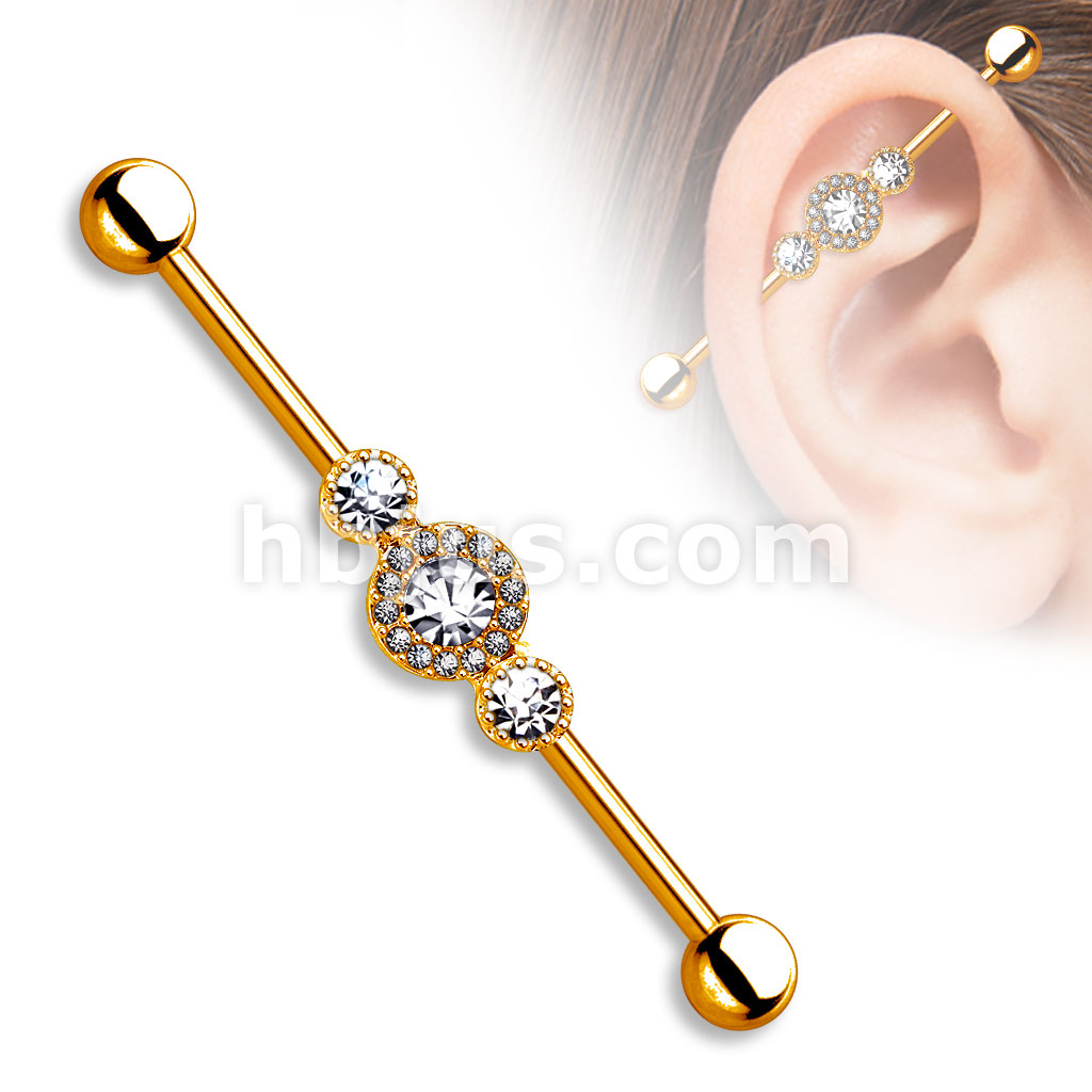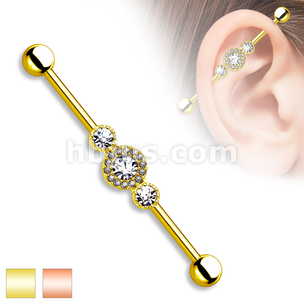 Three CZ Centered Multi Paved Circle Gold Plated over 316L Surgical Steel Industrial Barbell