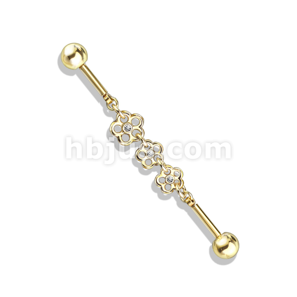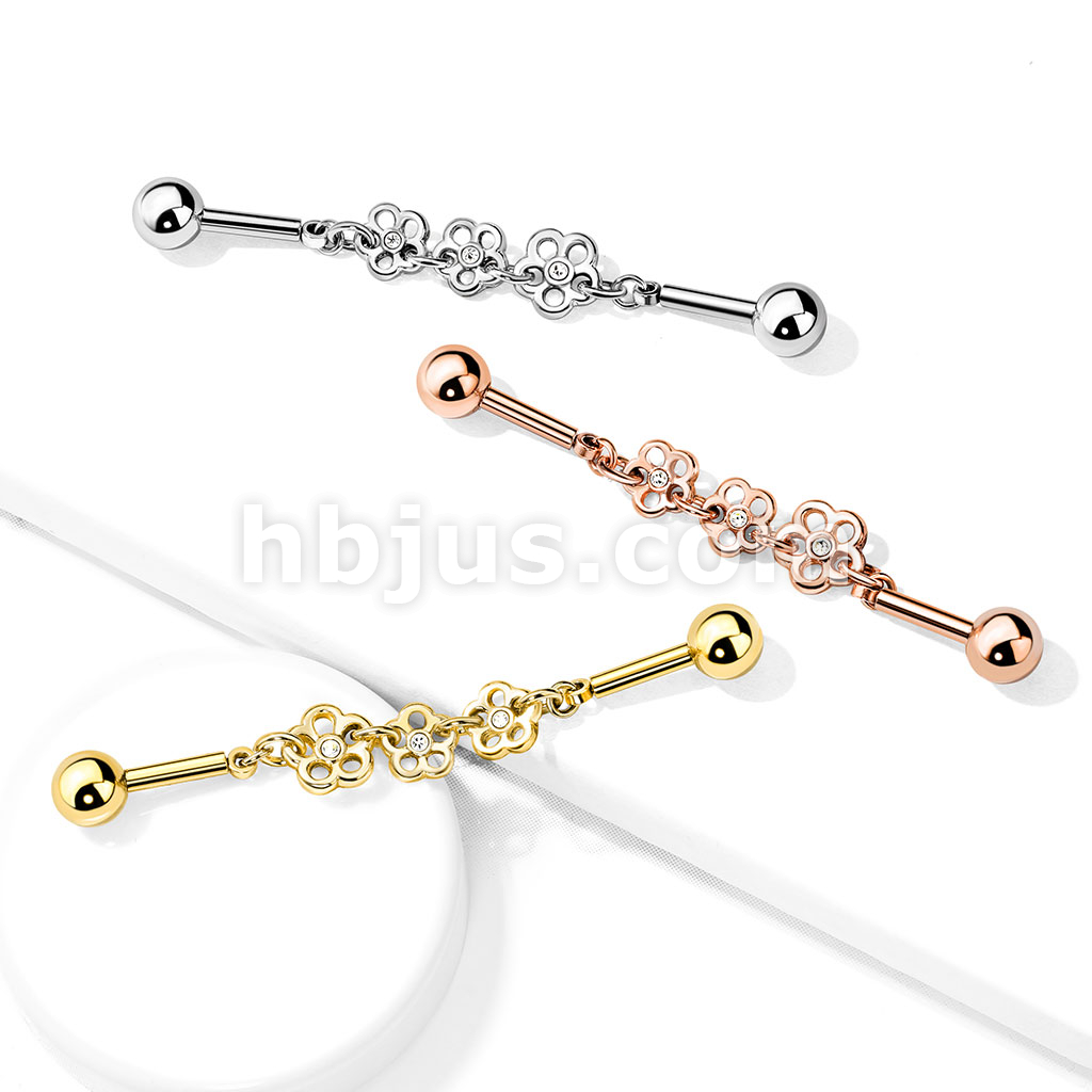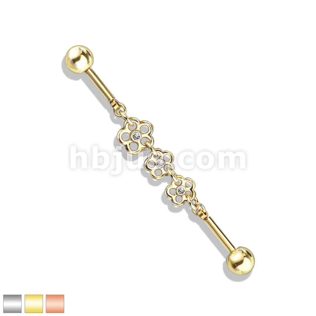 Triple Crystal Center Flower Chain 316L Surgical Steel Industrial Barbell