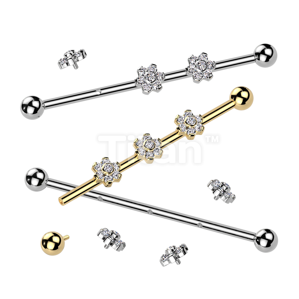 Implant Grade Titanium Internally Threaded Industrial Barbell With Three Titanium 6-CZ Flowers on Threaded Bar