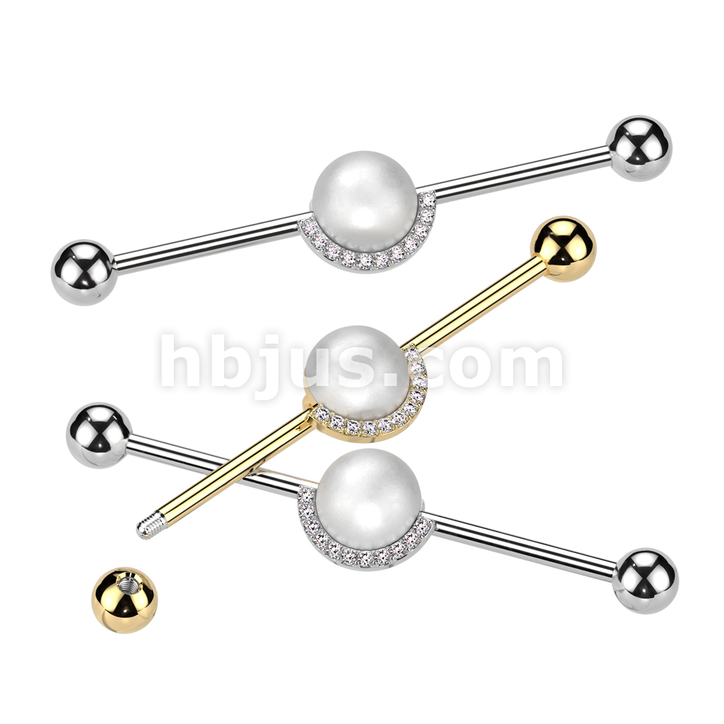 316L Surgical Steel Industrial Barbell With Pearl and Half CZ Rim Edge