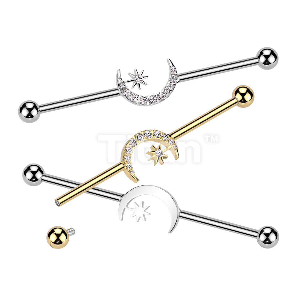 Implant Grade Titanium Internally Threaded Industrial Barbell With CNC Set CZ Crescent Moon and CZ Star