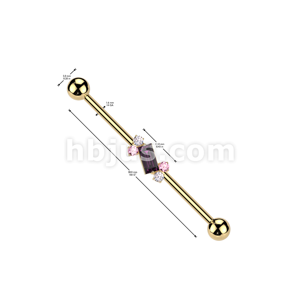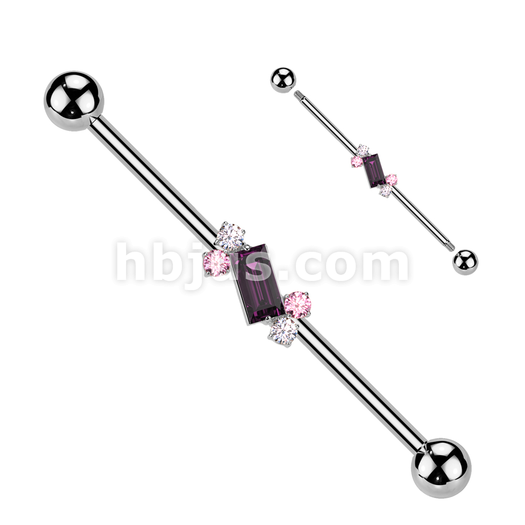 316L Surgical Steel Double Round CZ With Baguette CZ Center Industrial Barbell