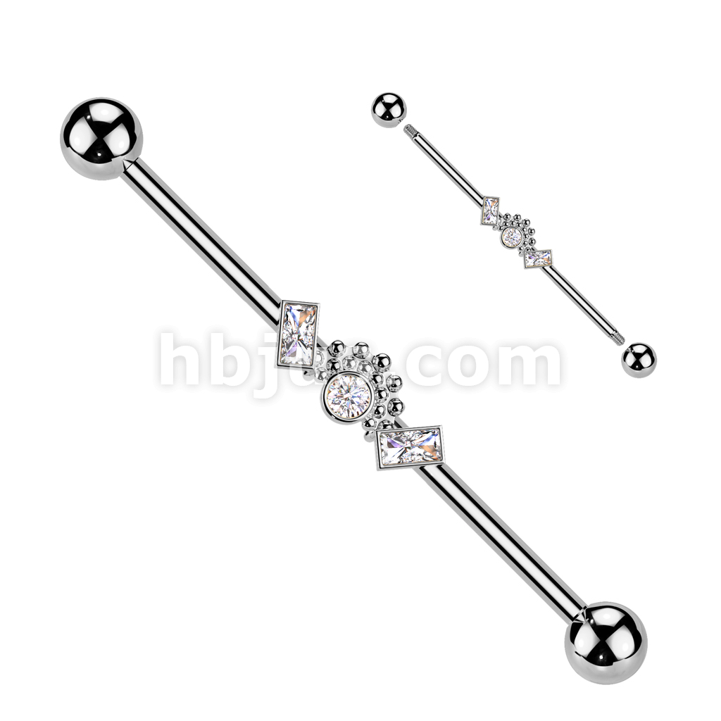 316L Surgical Steel Double Baguette CZ Ends With Ball Clusters And Round CZ Center Industrial Barbell