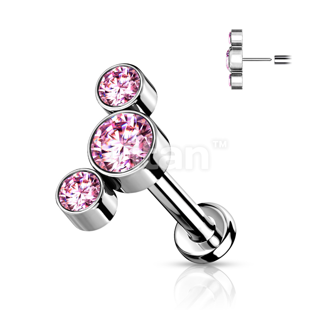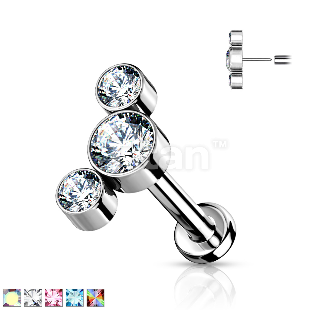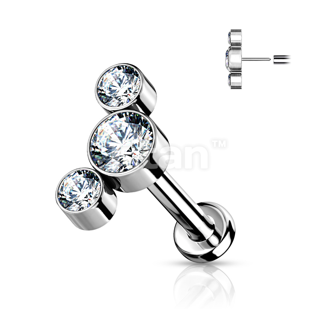 Implant Grade Titanium Threadless Push in Labret With 3 Round Bezel Set CZ Curved Top
