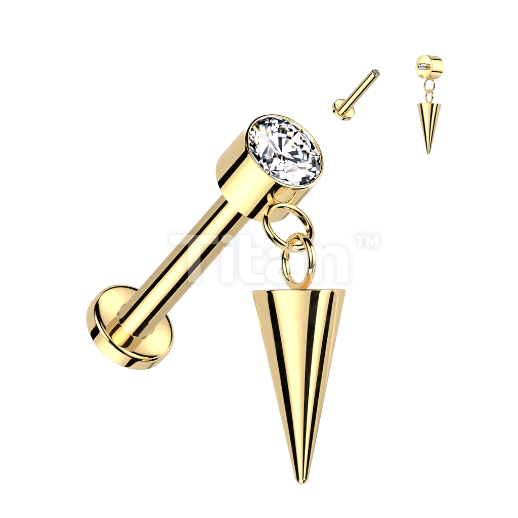Implant Grade Titanium Internally Threaded Labret With Round Bezel Set CZ and Cone Dangle Top