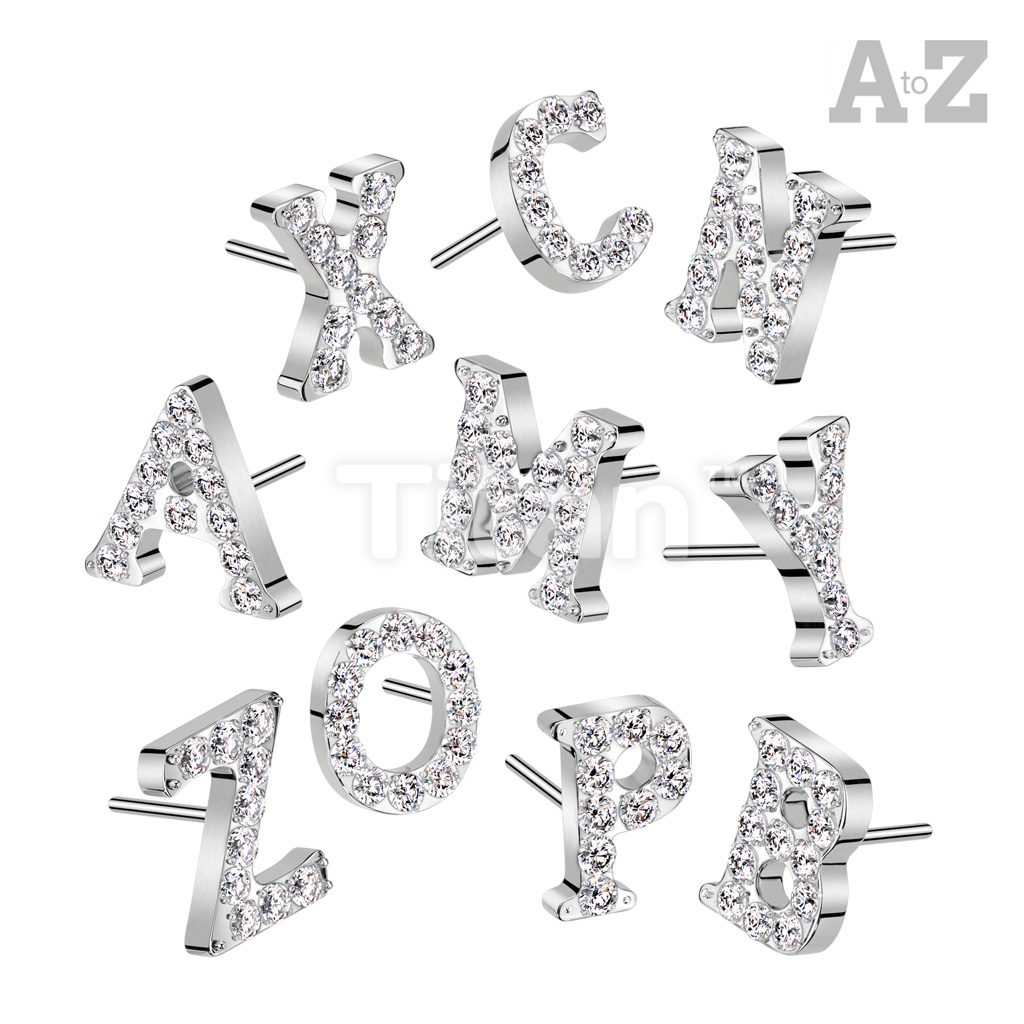Implant Grade Titanium Threadless Push In CNC Set CZ Paved Alphabet Initial Top. 26 Pcs With Titan Display Pack