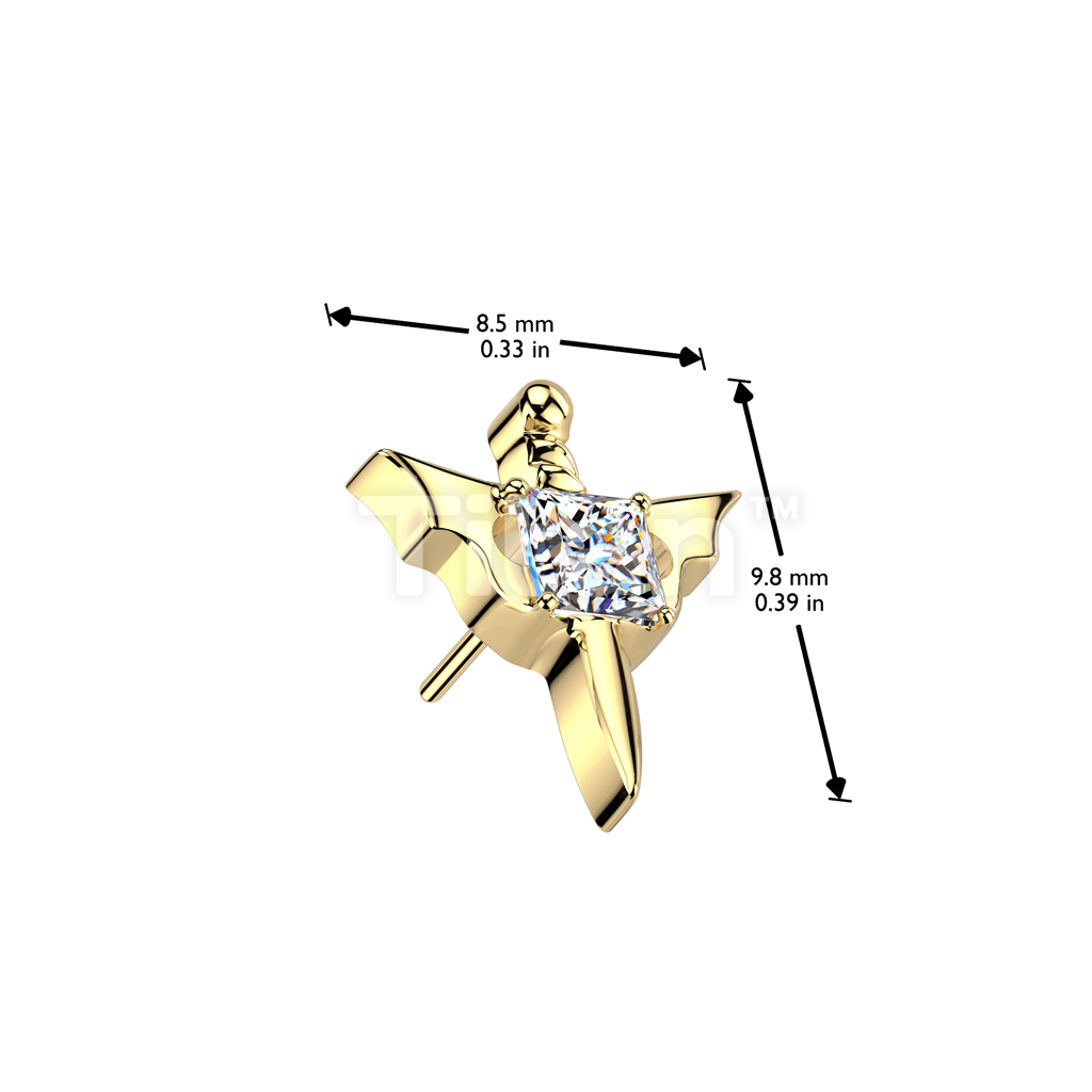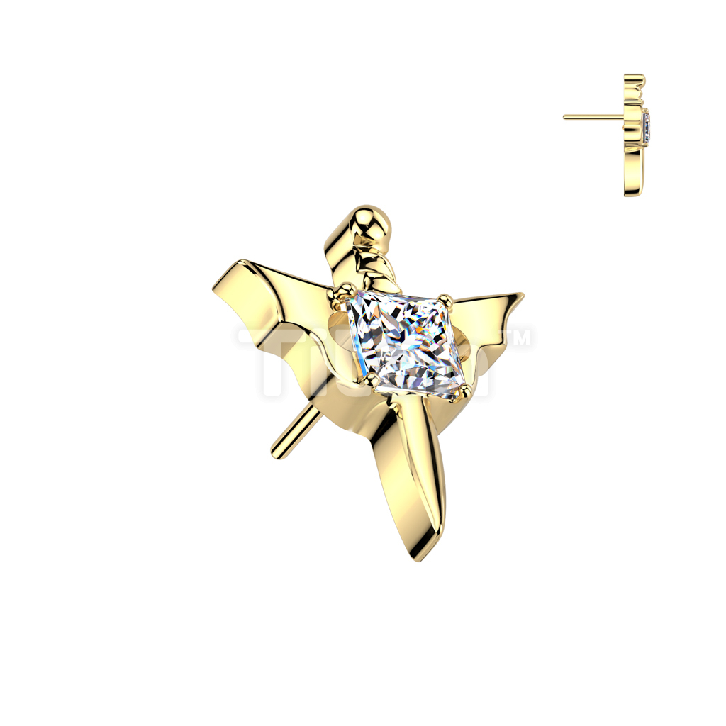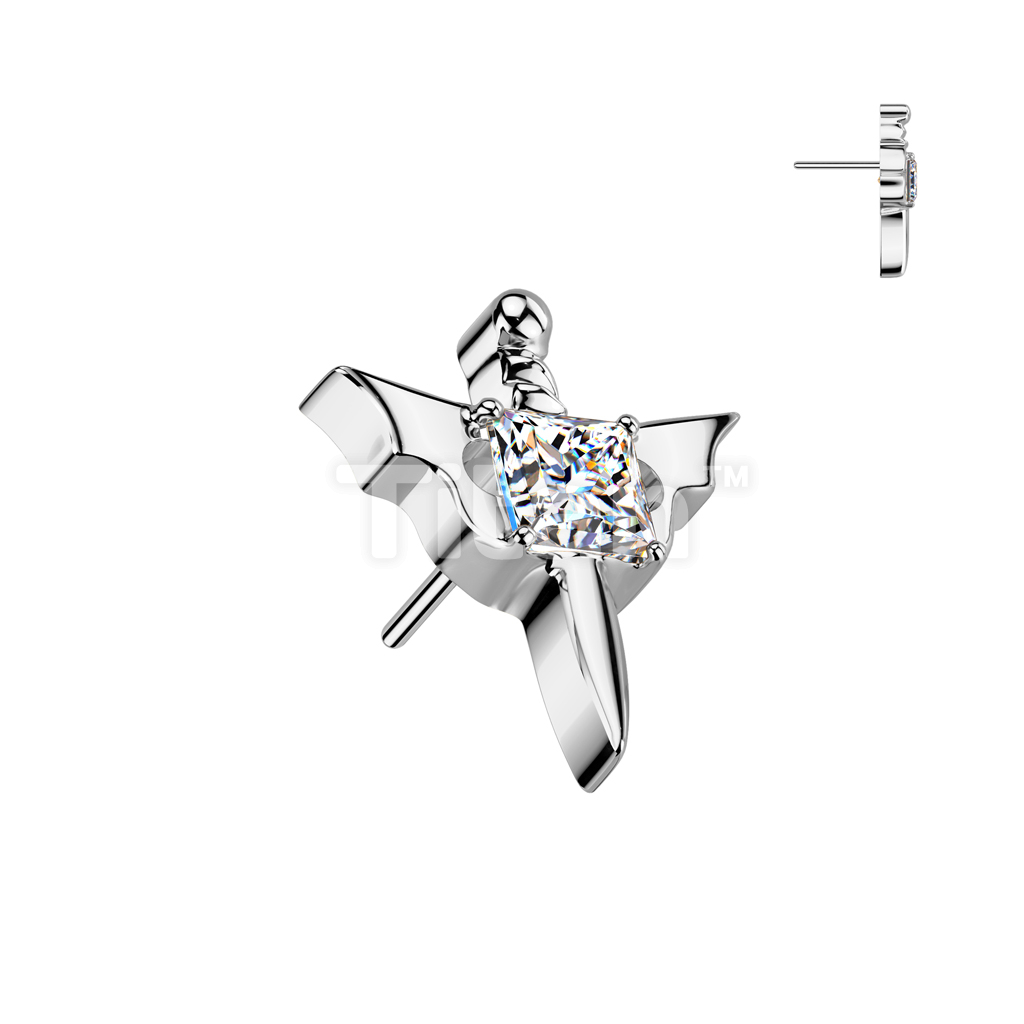 Implant Grade Titanium Threadless Push In Dagger With Square CZ Center and Bat Wings Top