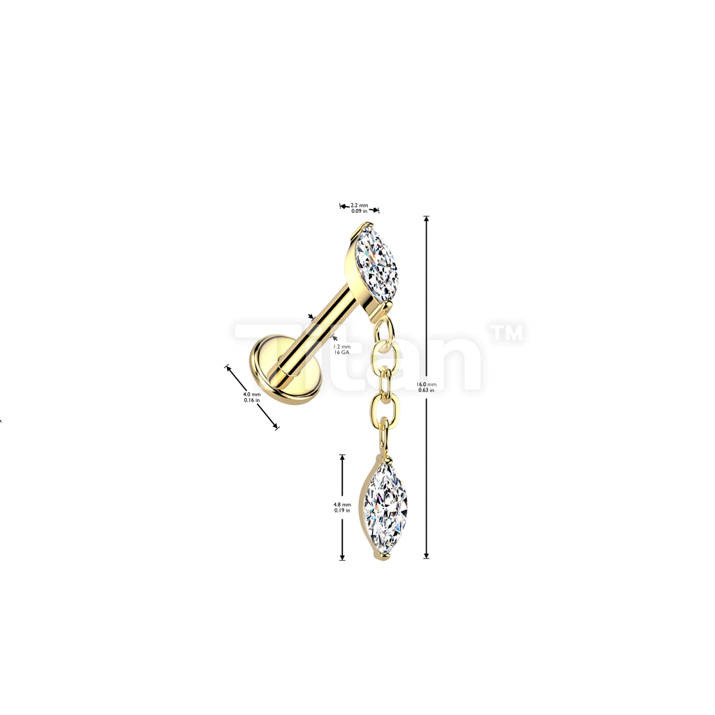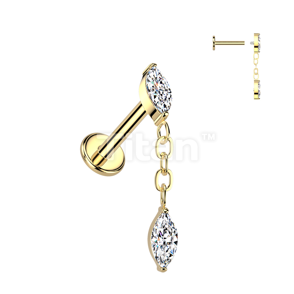 Implant Grade Titanium Internally Threaded Marquise CZ Labret, Flat Back Stud With Marquise CZ Dangle