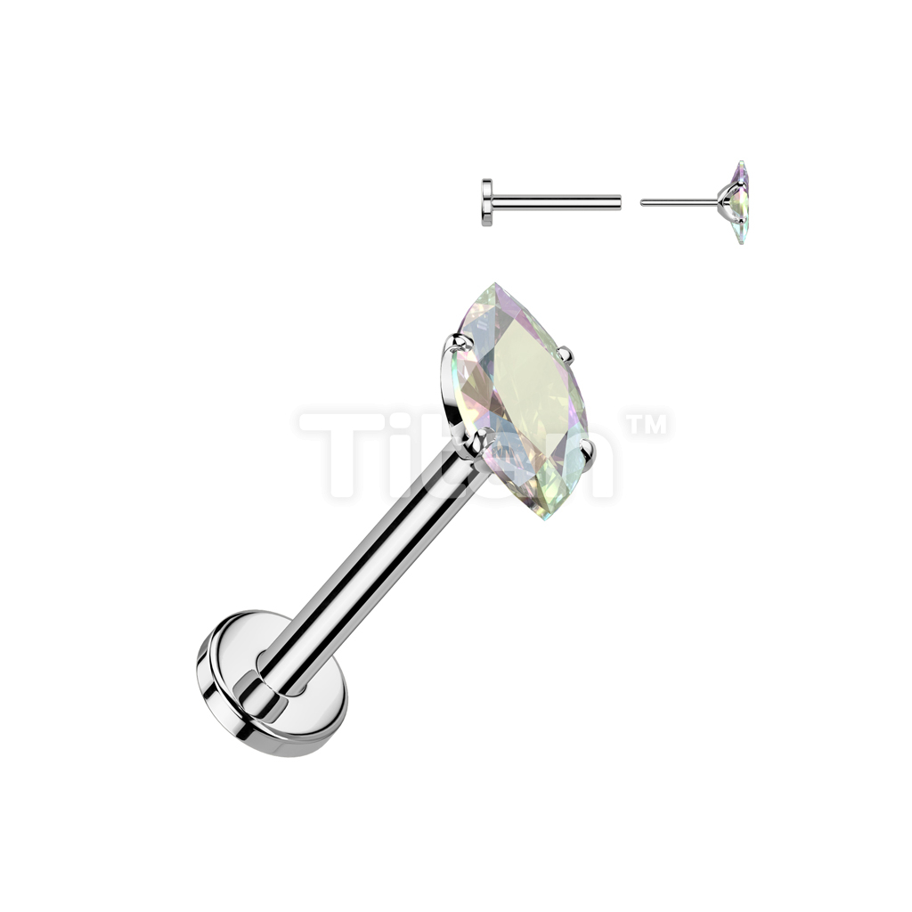 Implant Grade Titanium Threadless Push In Flat Back Stud With Prong Set Marquise CZ Top