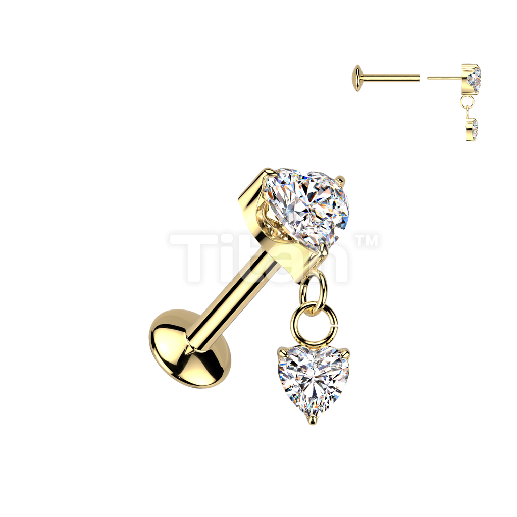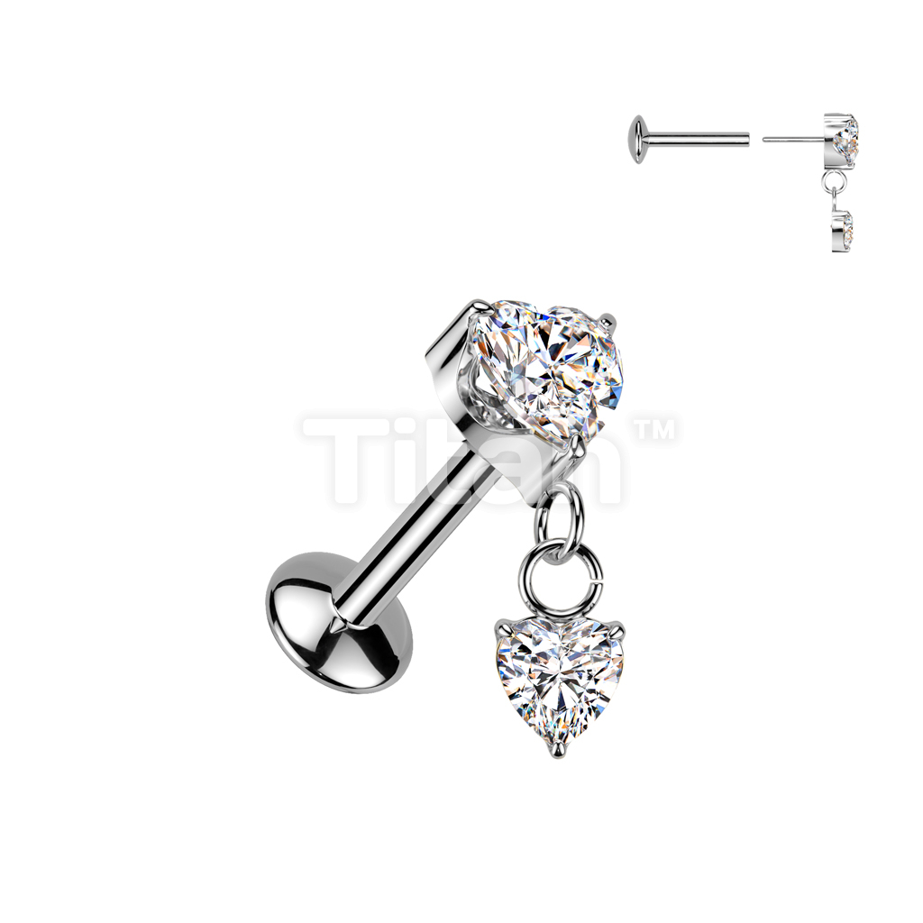 Implant Grade Titanium Threadless Push In Convex Base Labret Stud With Prong Set Heart CZ Top With Prong Set Heart CZ Dangle