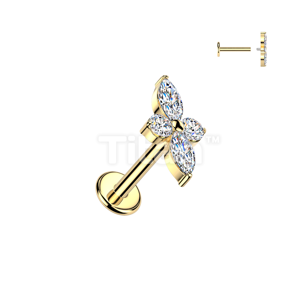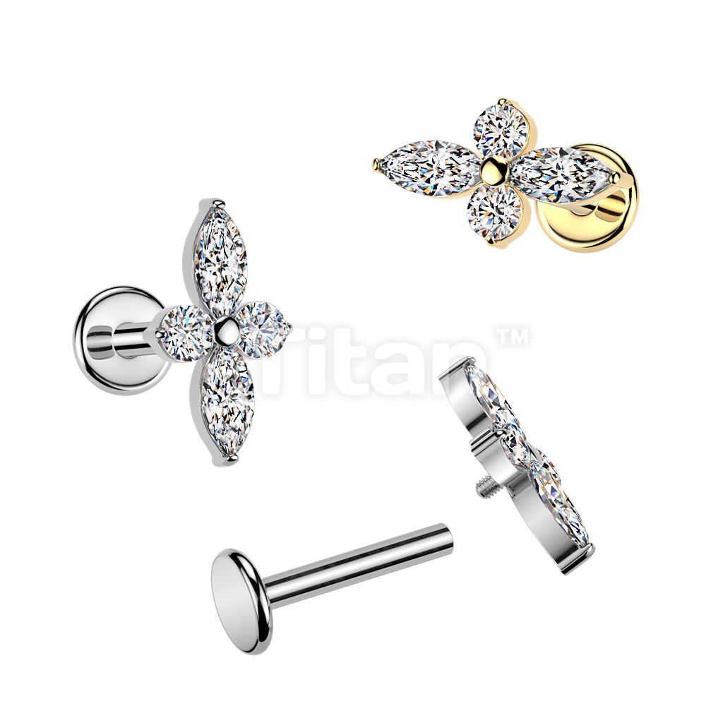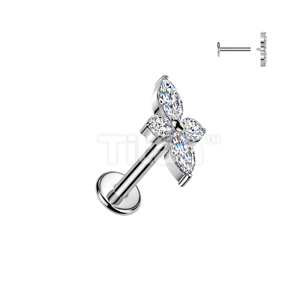 Implant Grade Titanium Internally Threaded Labret, 4mm Flat Back Stud With Marquise And Round CZ Cross Top