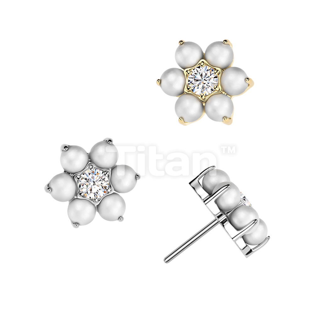 Titanium Threadless Push In Pearl Set With CZ Center Flower Top