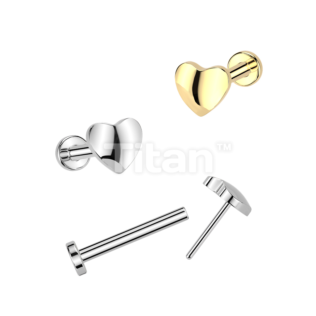 Titanium Threadless Push In Flat Back Stud With 3D Heart Top For Nose, Ear and More