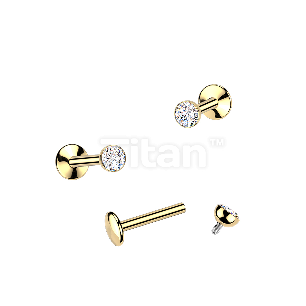 24K Gold PVD Titanium Internally Threaded Convex Back Labret With Bezel Set CZ Top