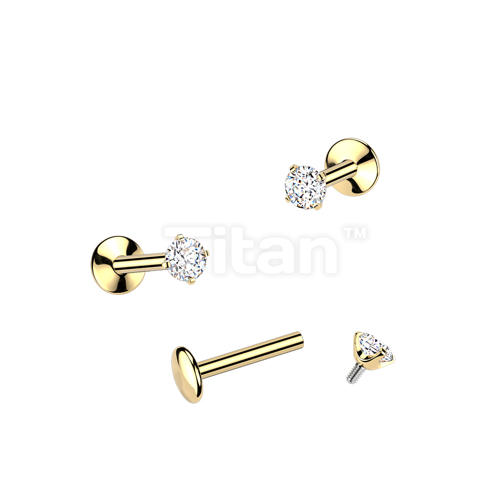 24K Gold PVD Titanium Internally Threaded Convex Back Labret With Prong Set CZ Top
