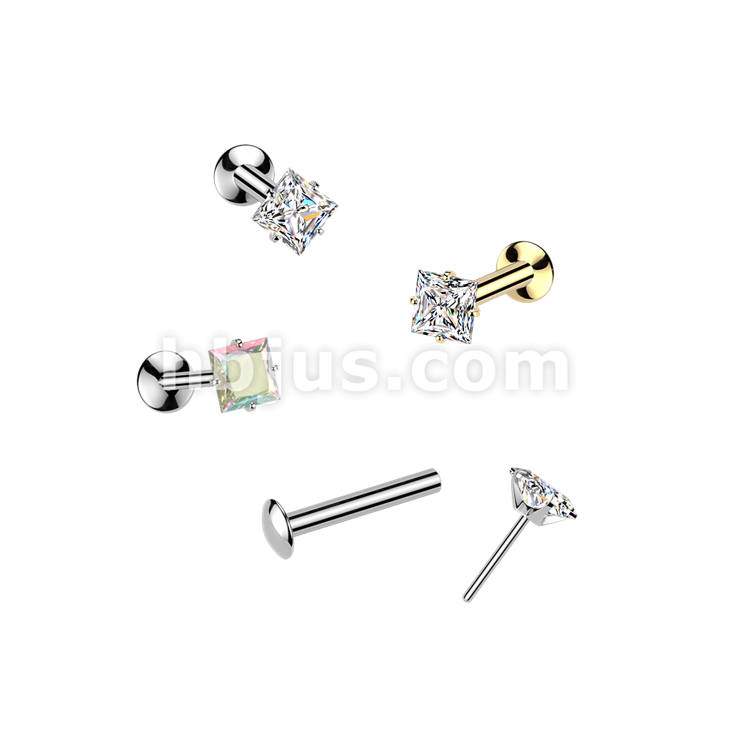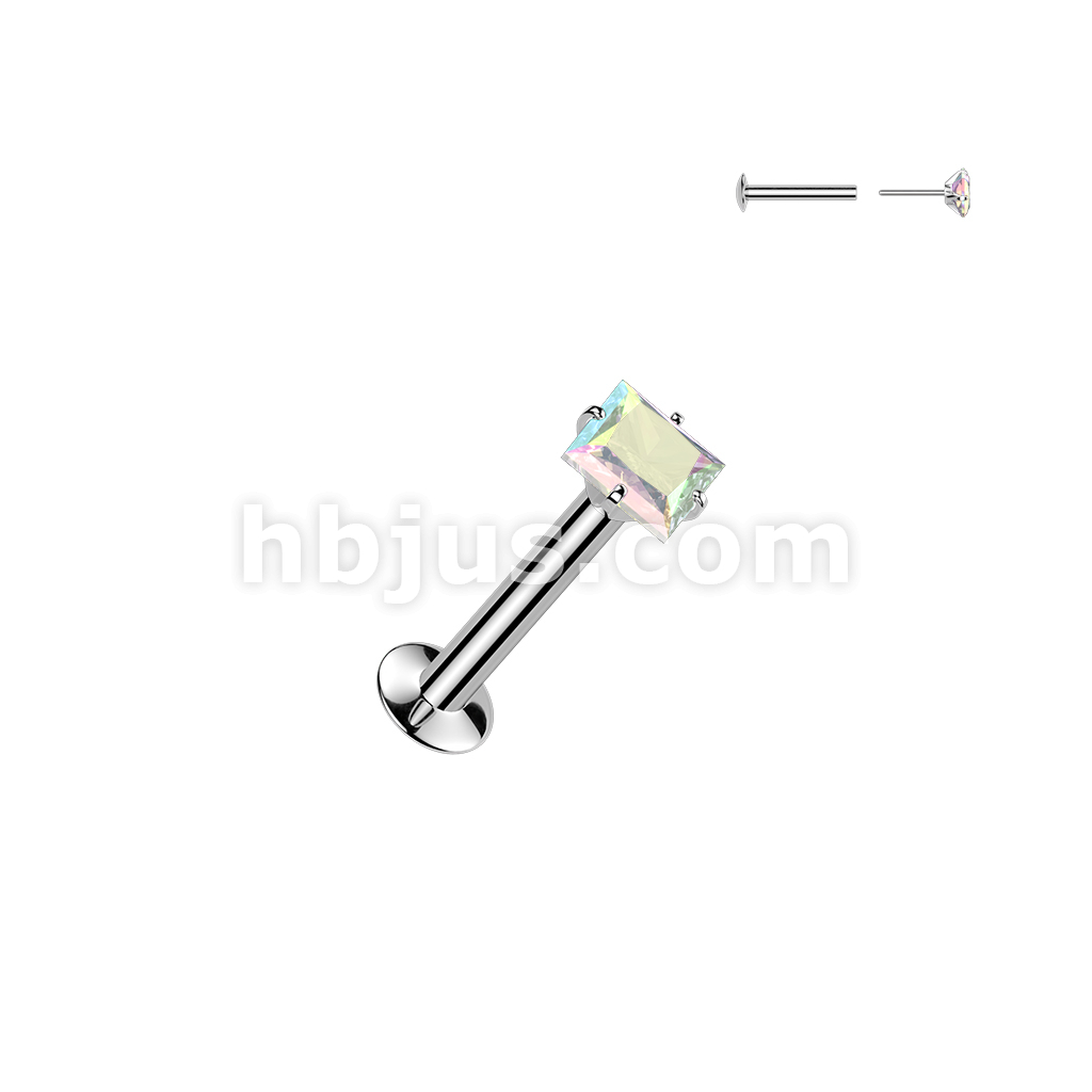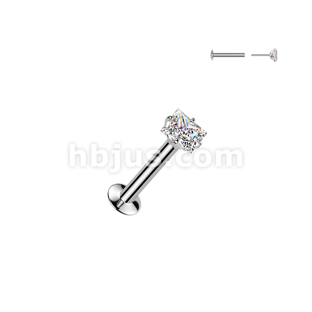 316L Threadless Flat Back Labret With Push In Prong Set Square CZ Top