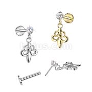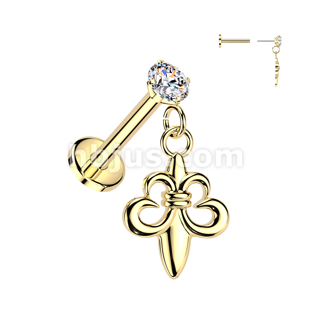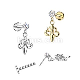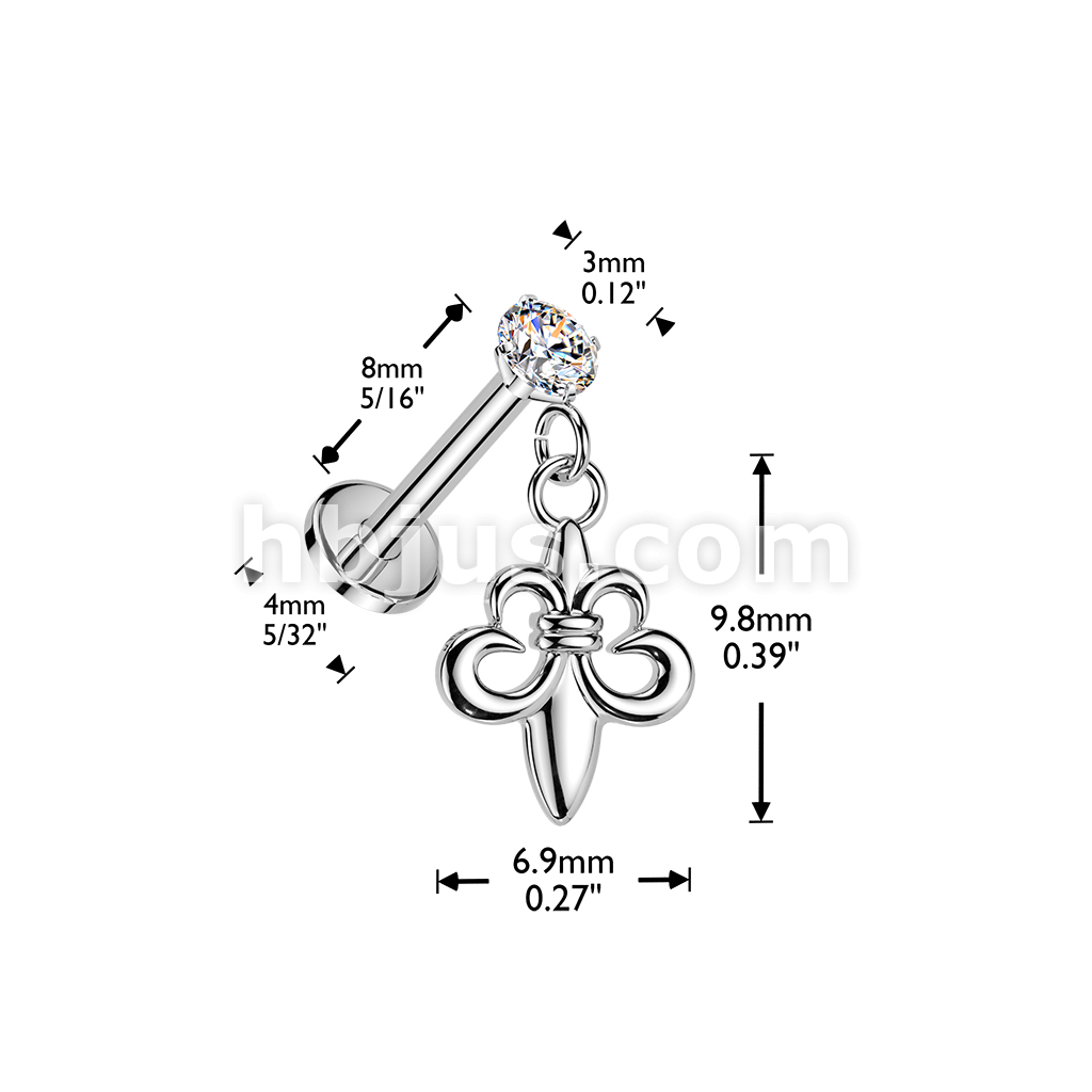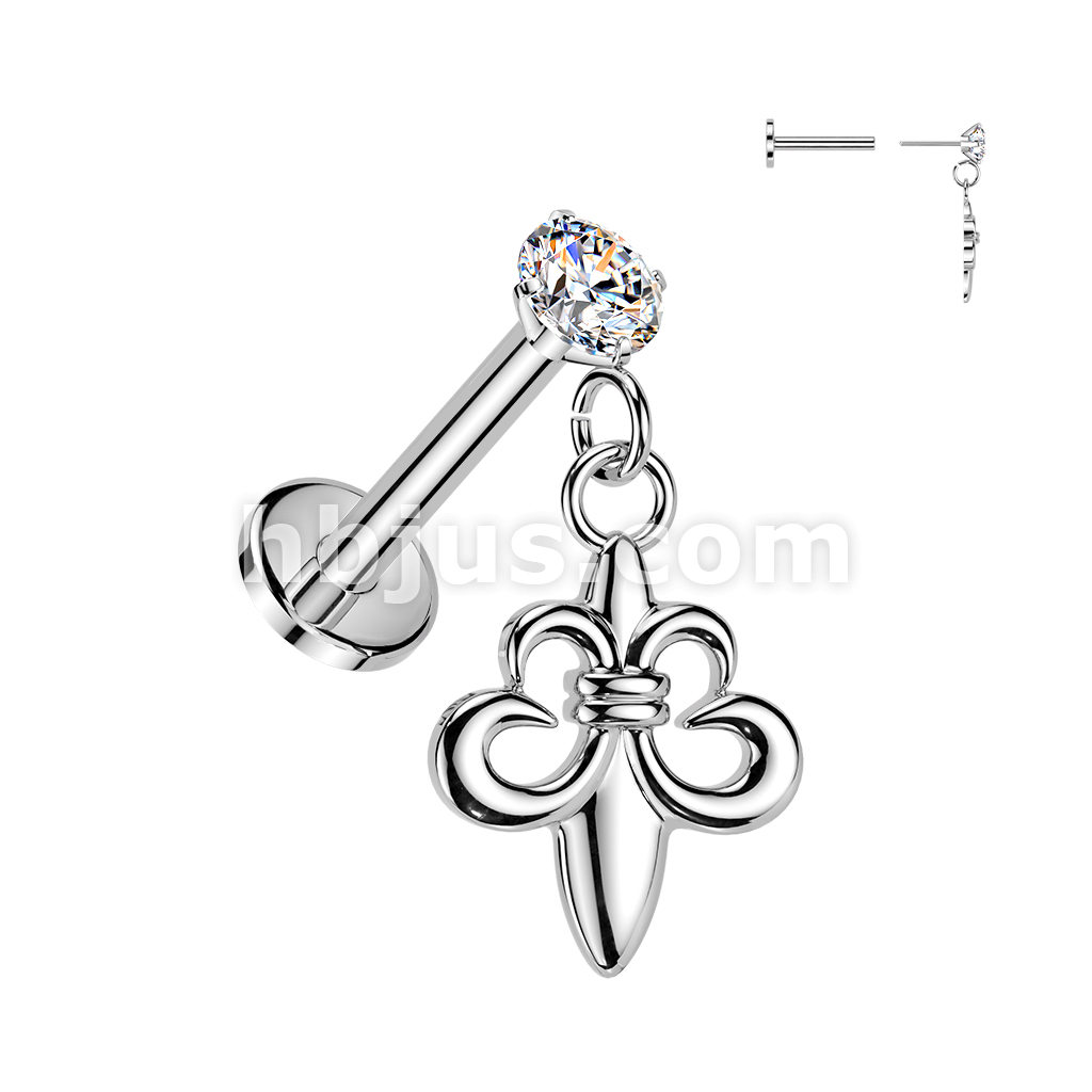 316L Threadless Push In Flat Back Stud With Prong Set CZ & Fleur De Lis Dangle