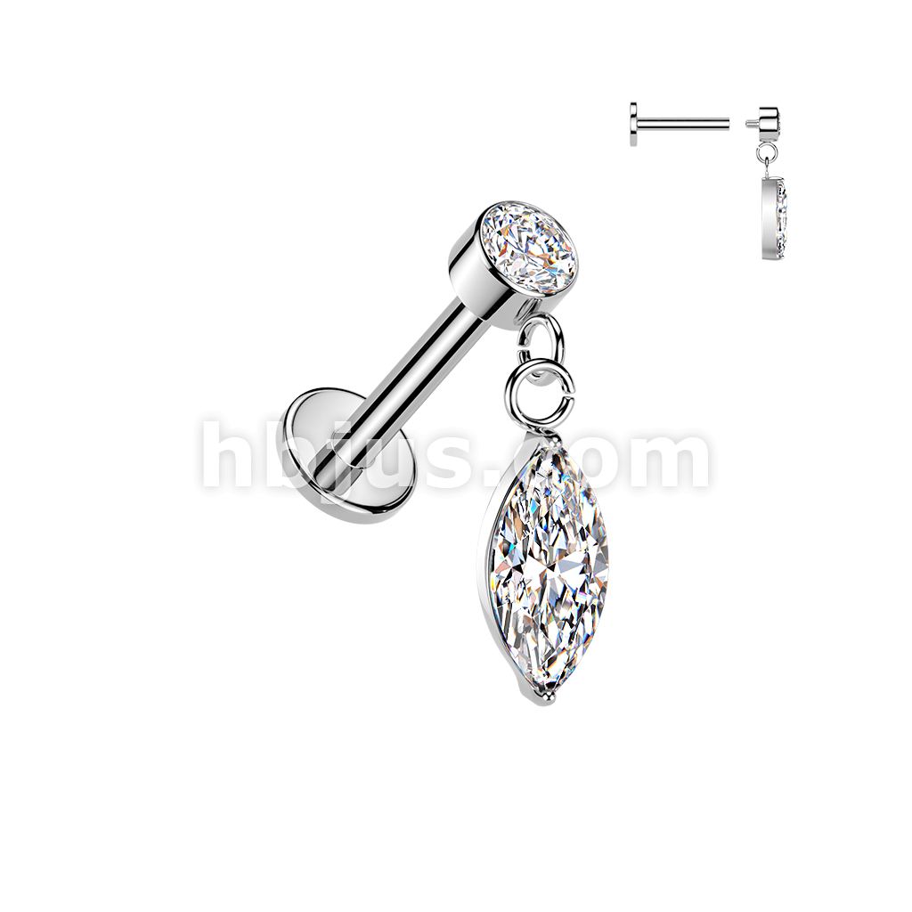 All 316L Internally Threaded Flat Back Labret With Bezel Set CZ & Marquise CZ Dangle