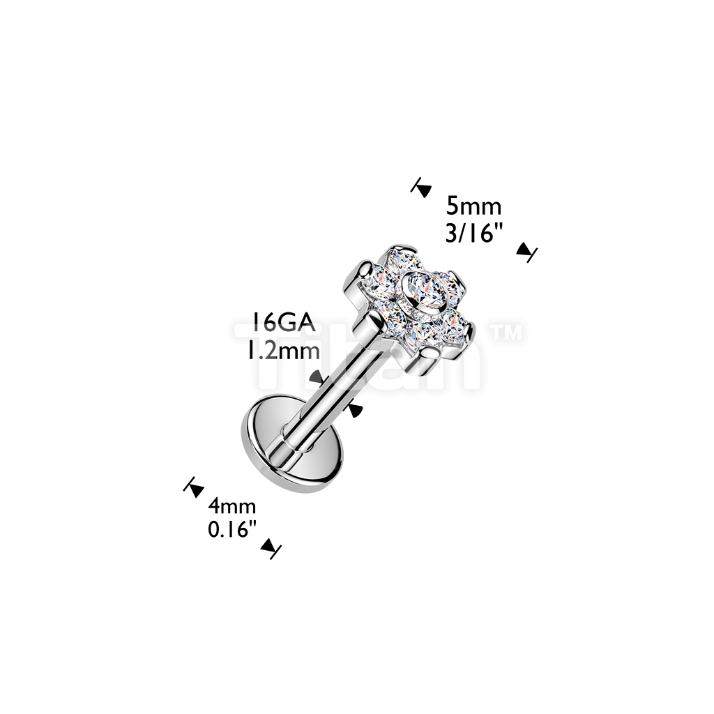 Titanium Internally Threaded Flat Back Labret With 7 CZ Flower Top