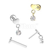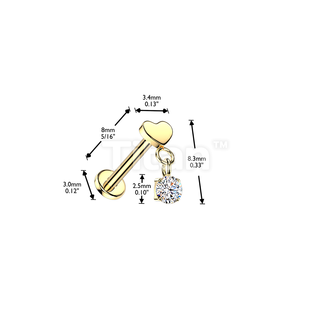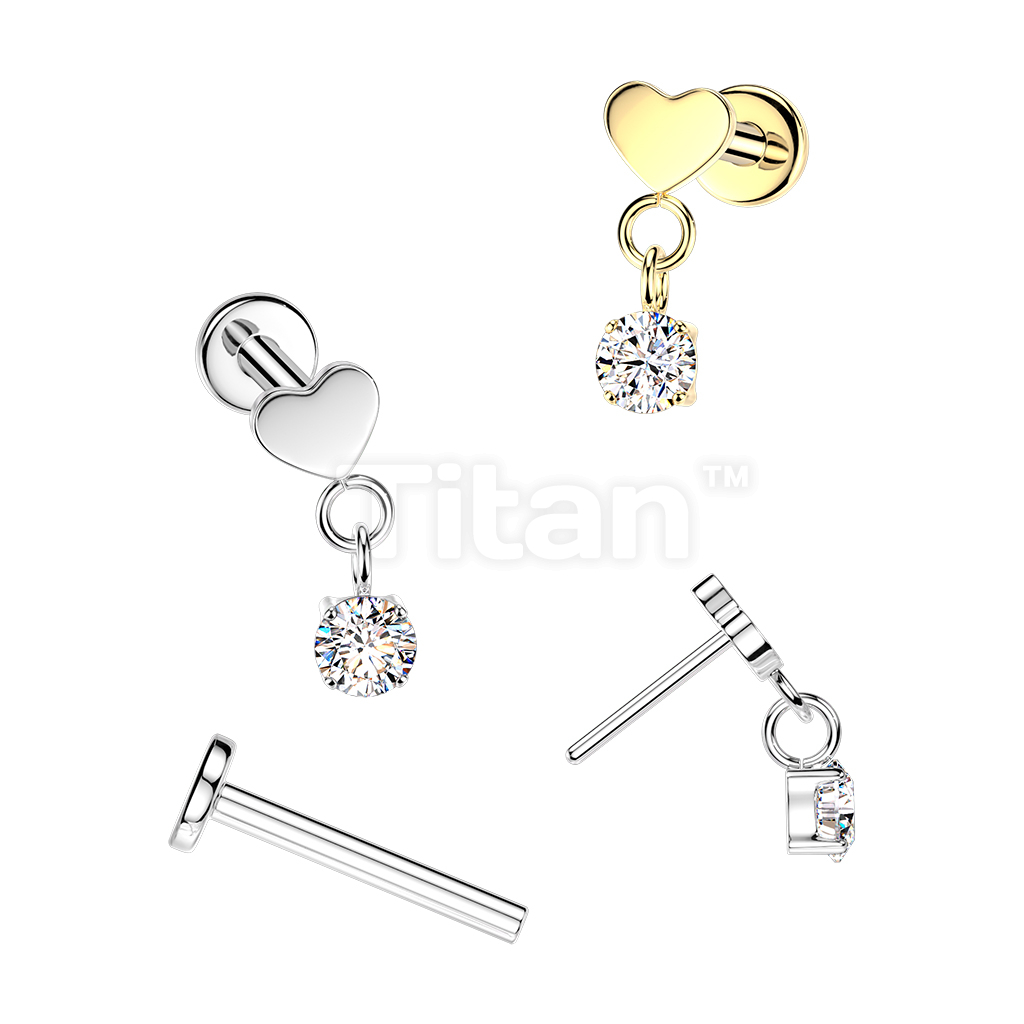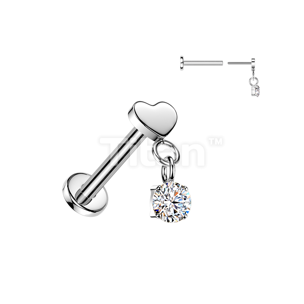 Titanium Threadless Push In Flat Back Labret With Flat Heart Top And Round CZ Dangle