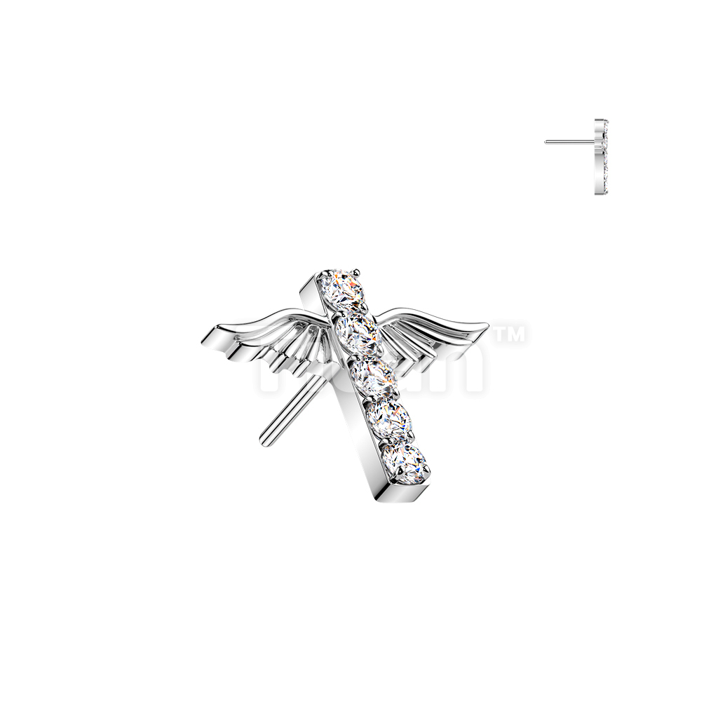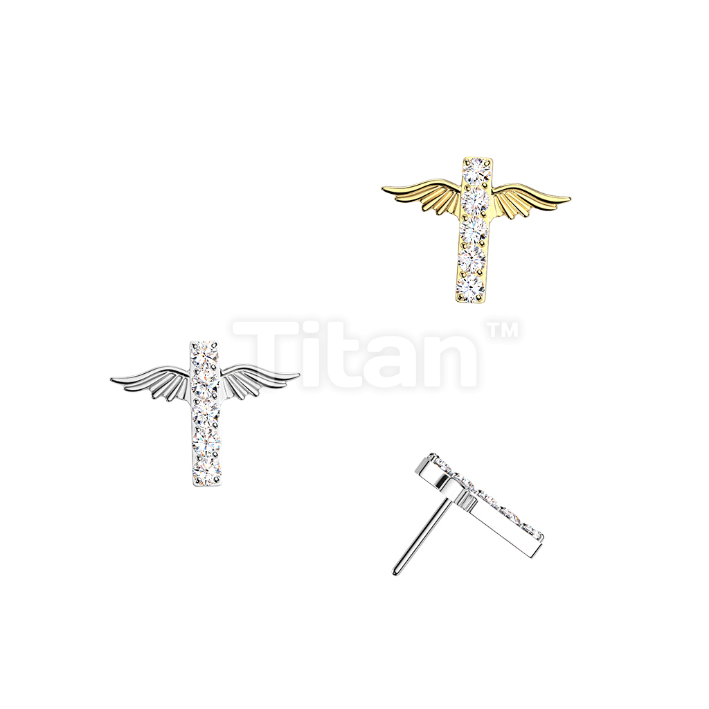 Titanium Threadless Push In Angel Wings Pave CZ Cross Top