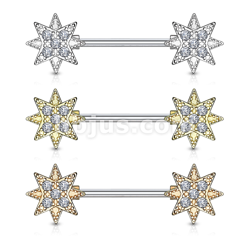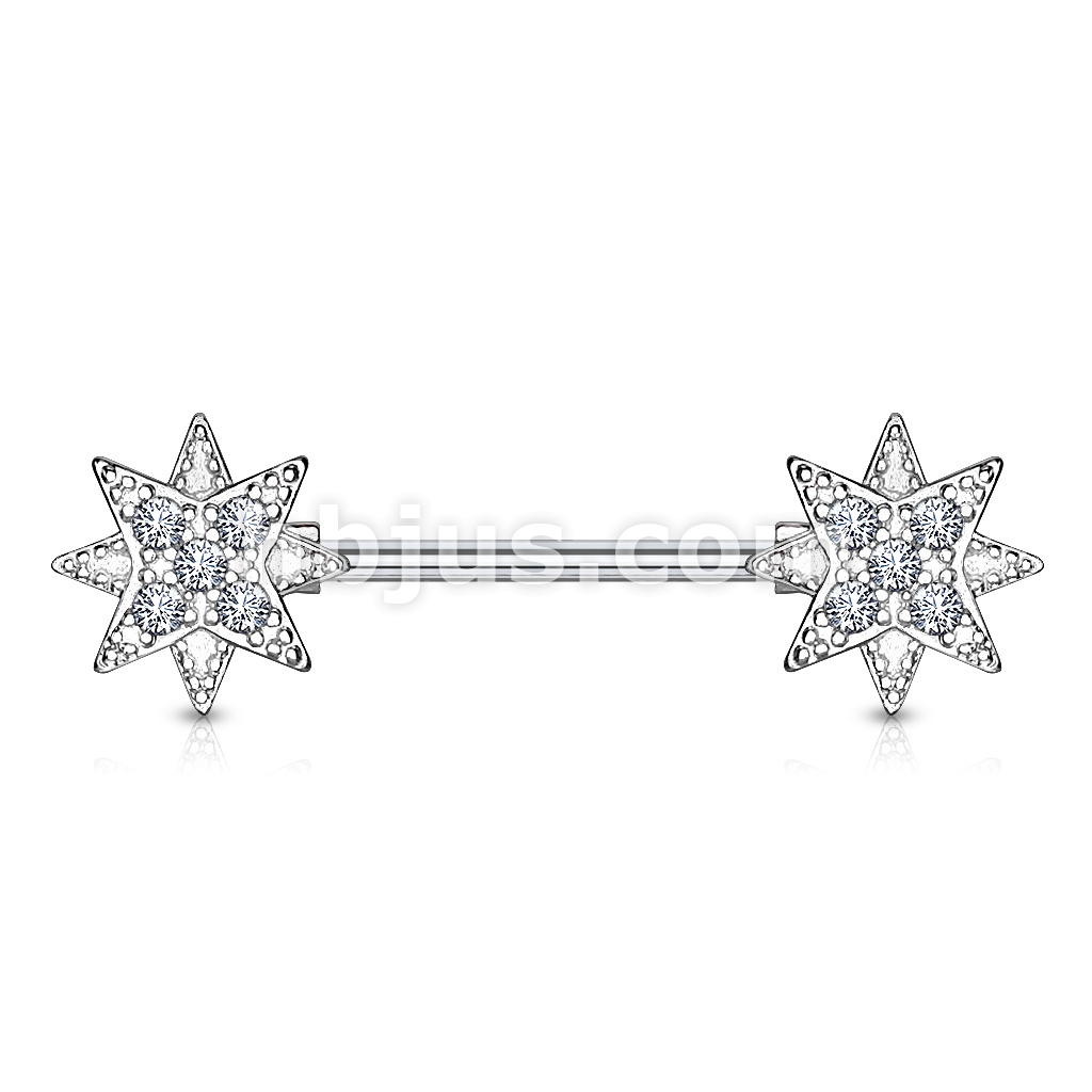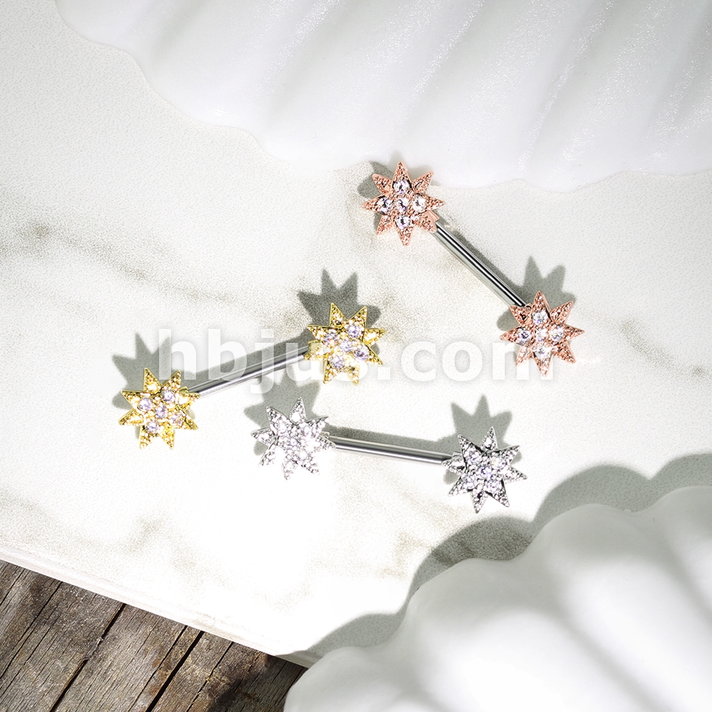 CZ Paved Starburst Ends 316L Surgical Steel Nipple Barbell Rings