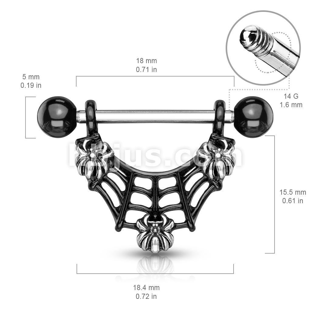 3 Spiders On Black IP Spider Web Dangle 316L Surgical Steel Nipple Rings