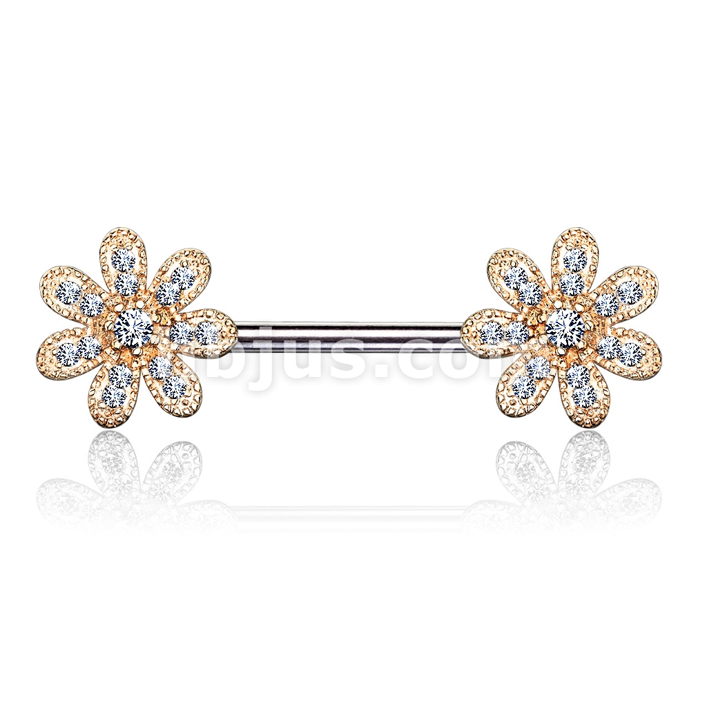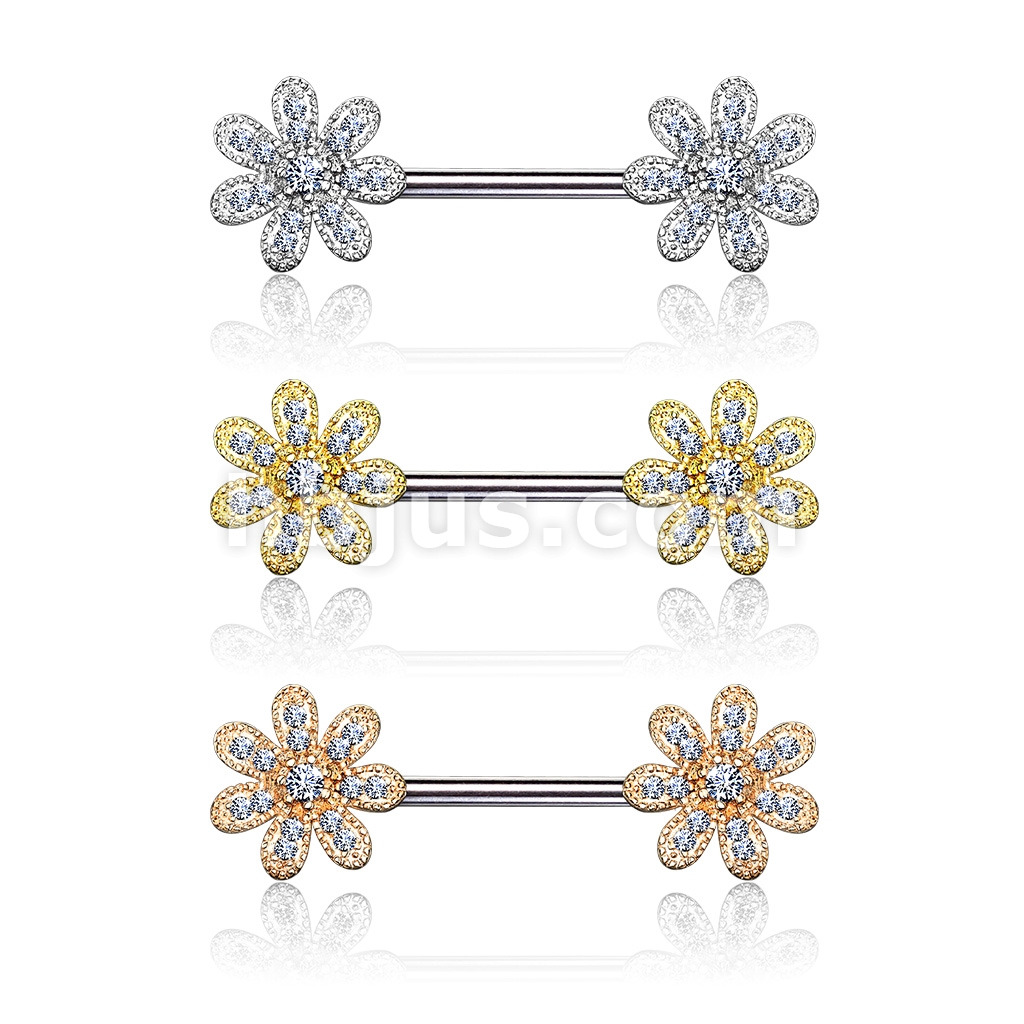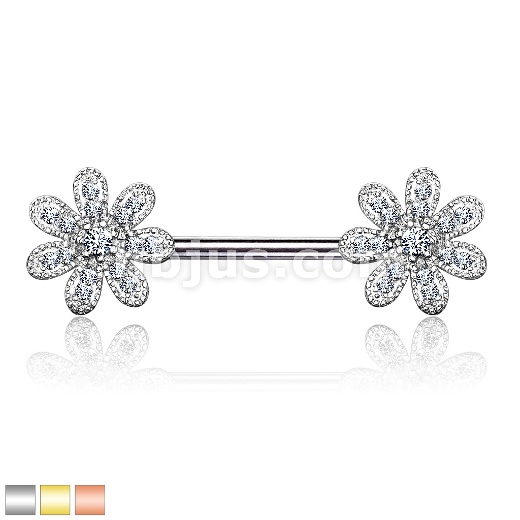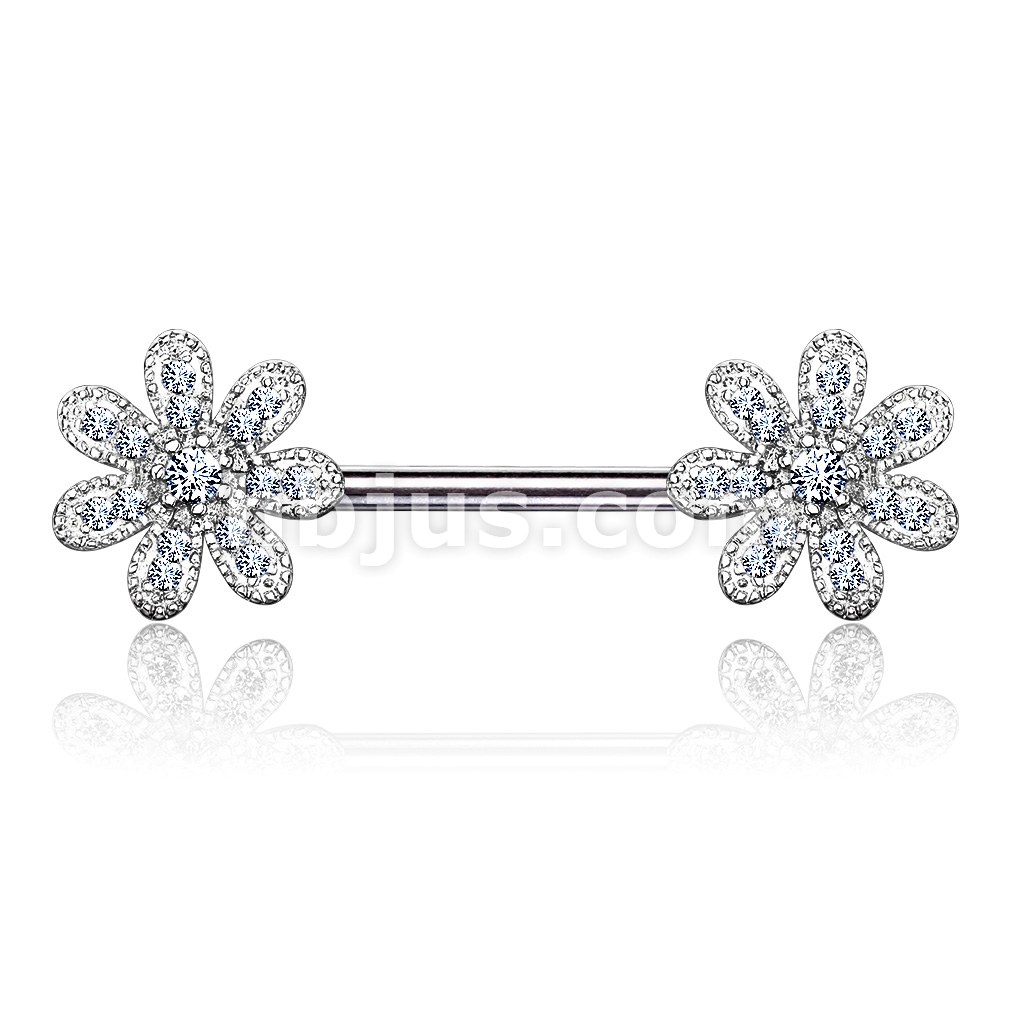 CZ Gem Paved Flower 316L Surgical Steel Nipple Barbell Rings