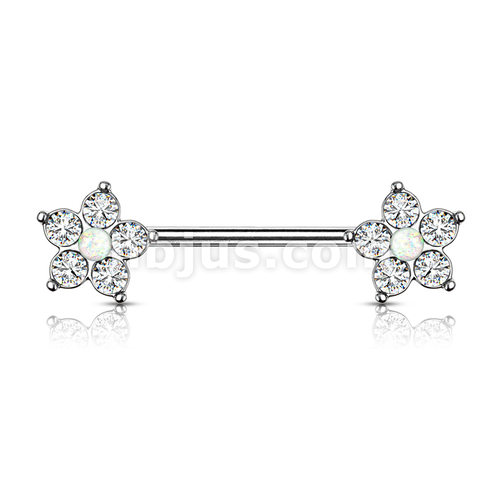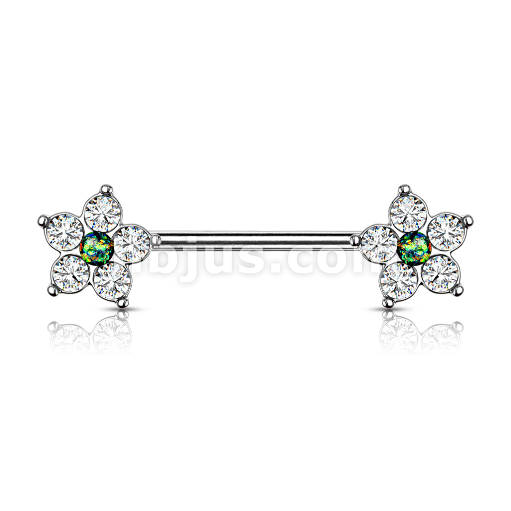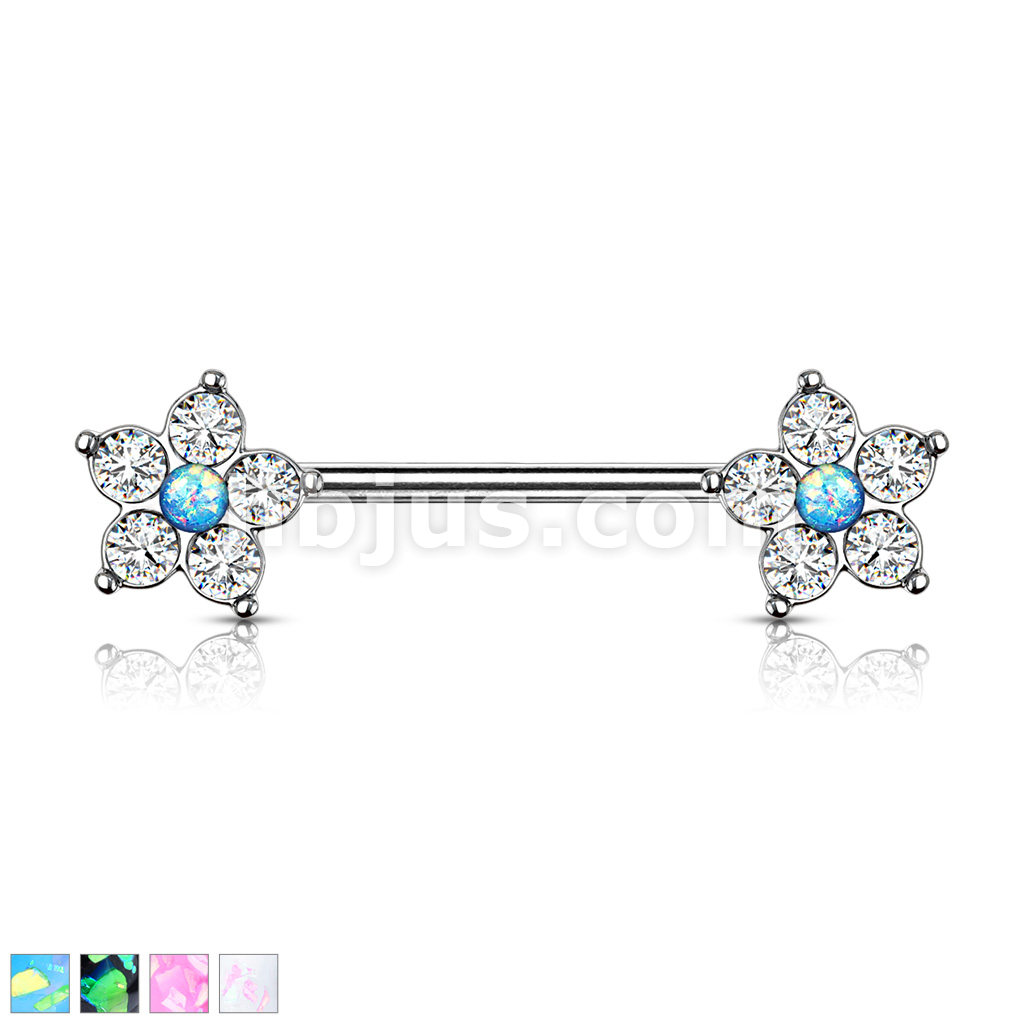 5 CZ Flower with Opal Glitter Center 316L Surgical Steel Nipple Barbell Rings